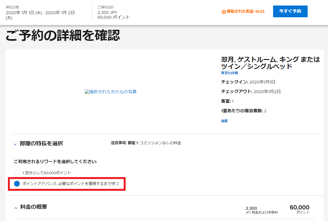 ポイントでの無料宿泊の予約画面で以下のように「ポイントアドバンス」を選択するだけでOKです。