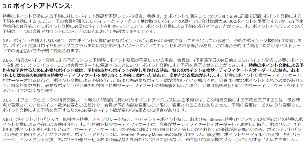 3.6.d. ポイントアドバンスは、無料宿泊特典、アップグレード特典、キャッシュ+ポイント特典、およびPointSavers特典 (セクション3.2参照) などの特典のポイント交換による滞在にのみ使用可能です。無料宿泊特典サーティフィケートは、会員がサーティフィケートをオーダーして添付した時点、および/または予約用にポイントを差し引いた時点で、サーティフィケートにこの予約の1泊以上分の宿泊料金と等しいかそれ以上の価値がある場合にのみ、ポイントアドバンスの予約に使用することができます。ポイントアドバンスは、Marriott Bonvoy Momentsの体験プログラム、航空券、ポイントからマイルへの交換、旅行パッケージ、インスタント交換、およびその他サービスおよび商品などを含むがこれらに限らない、その他の特典交換オプションに使用することはできません。
