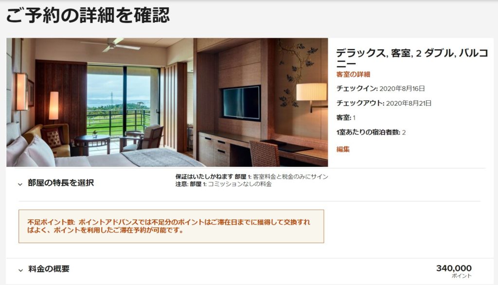 先ほどの予約画面の続きですが、ポイントが大幅に不足している(34万ポイント必要なのに15万ちょっとしか保持していない)のに予約ができることがお分かりいただけると思います。
