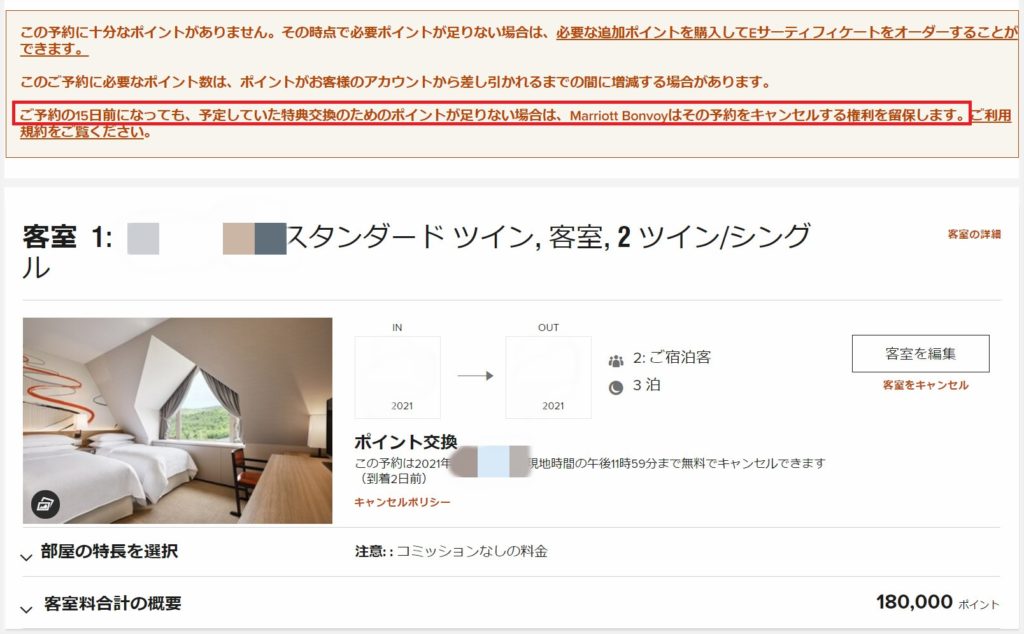 ご予約の15日前になっても、予定していた特典交換のためのポイントが足りない場合は、Marriott Bonvoyはその予約をキャンセルする権利を留保します。
