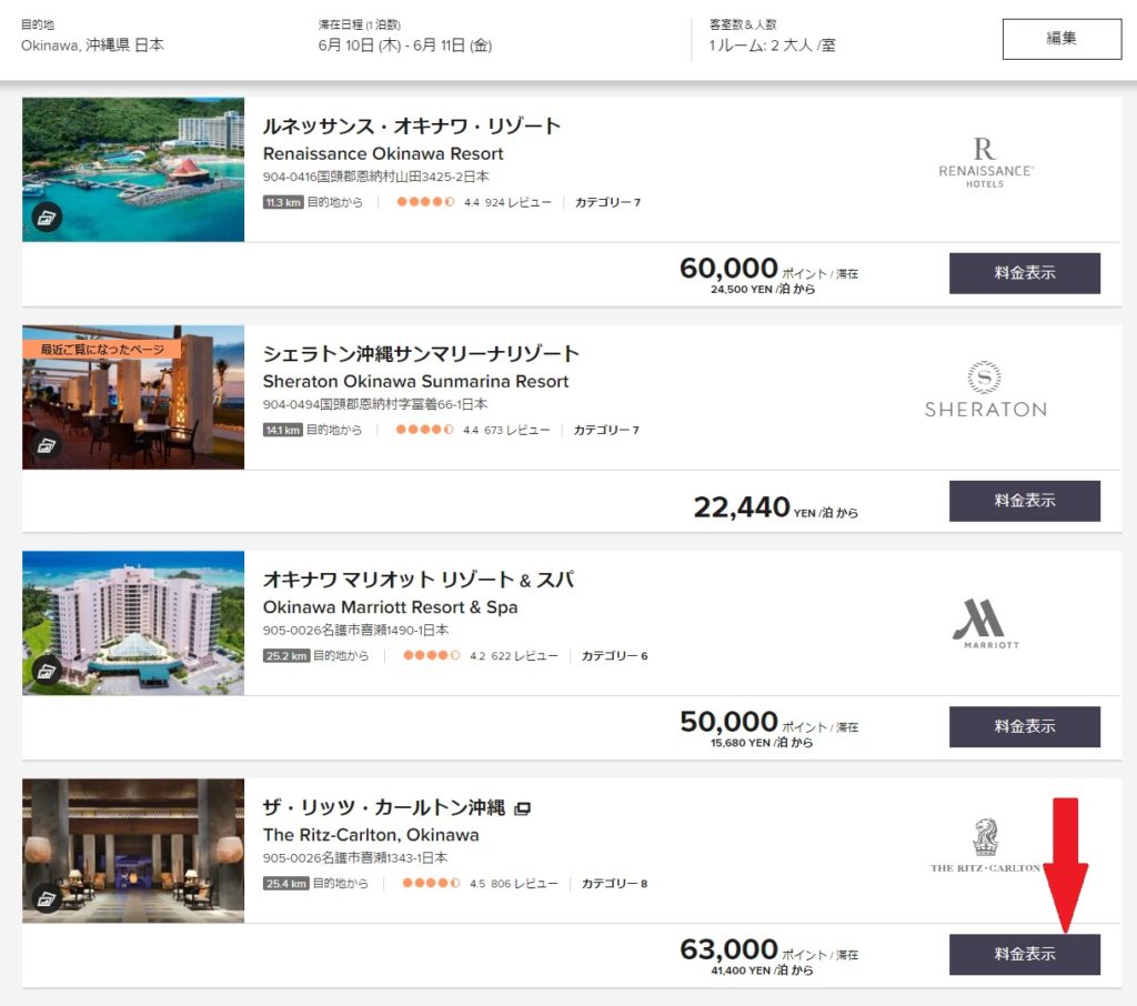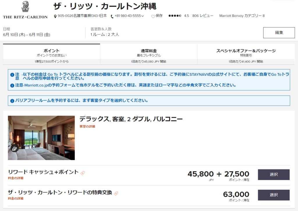 例えばプログラム統合前はリッツカールトン東京では20000ポイント、リッツカールトン大阪では30000ポイントの追加でクラブフロアへのアップグレードが可能でした(現在は不可となっています)。
