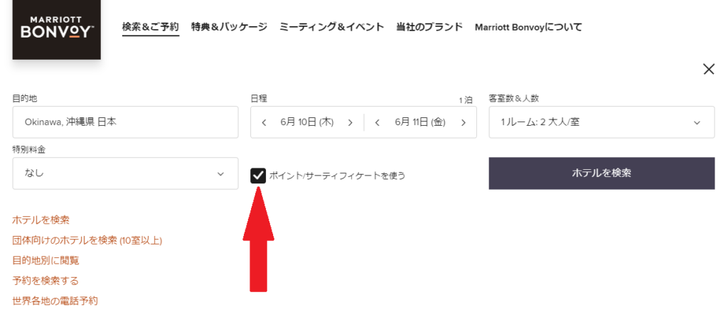予約の方法は簡単です!公式サイトから「ポイントの使用」にチェックを入れて検索します。