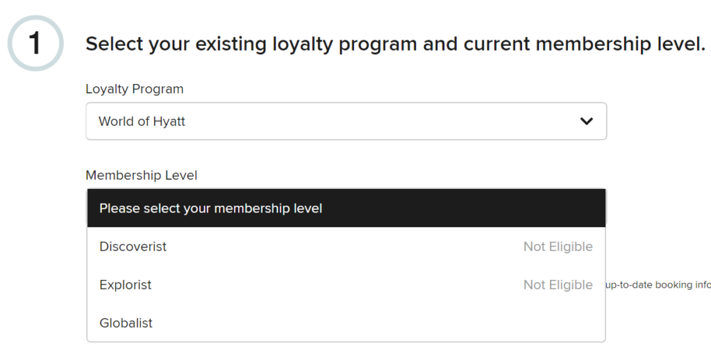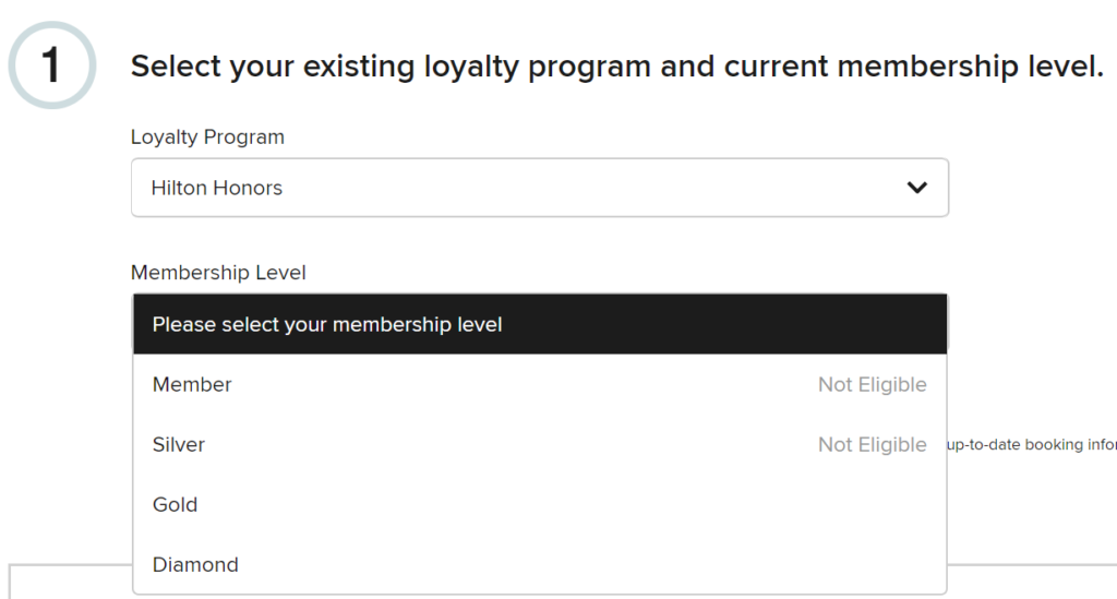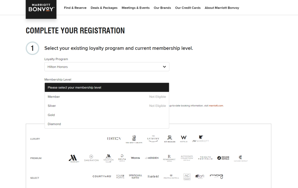 ステータスマッチ元となる各ホテルのロイヤルティプログラムを選択し、現在所持している会員レベルを選択します