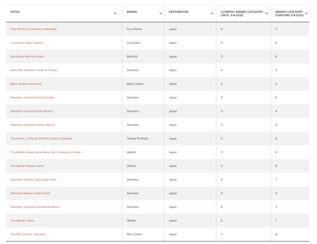 カテゴリー変更となったホテルのうち日本国内のホテルだけ抜き出して表にしました!