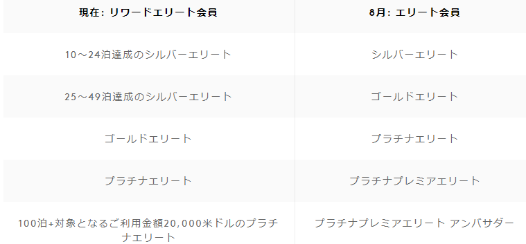 現在の会員レベルから下の表のように新しい会員レベル適用されるようです