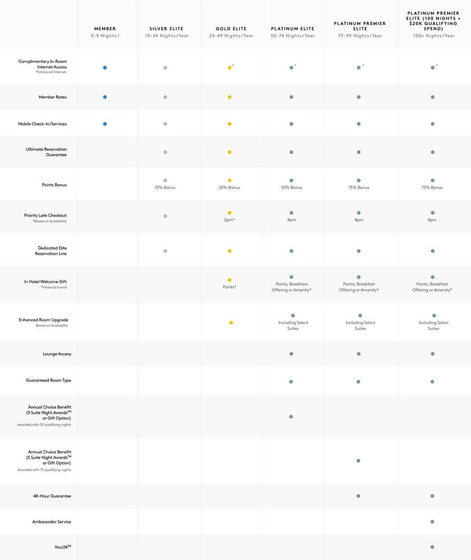 10泊のシルバー、25泊のゴールド、50泊のプラチナ、75泊のプラチナプレミア、100泊および2万ドル支払いのアンバサダーサービス付きのプラチナプレミアの5つのエリートティアがあります