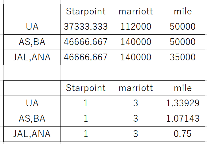 となりました。実はユナイテッド航空についてはマリオットリワードポイントからの交換がお得なのですが他については以下の通りSPGスターポイントから交換した方がお得です。