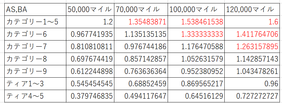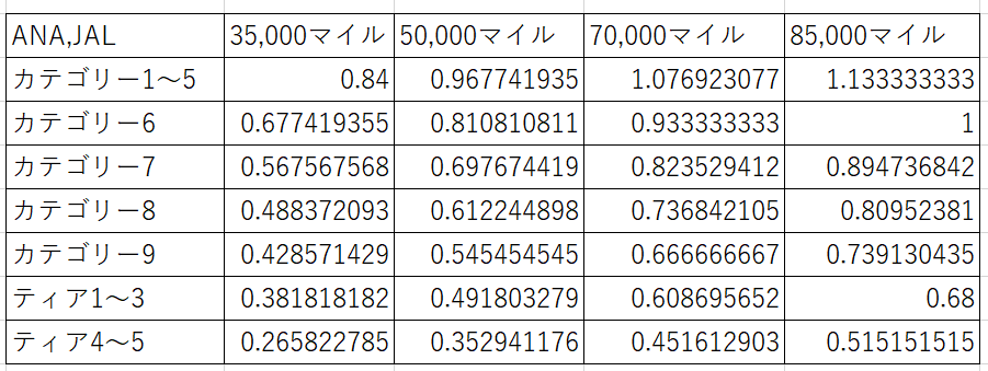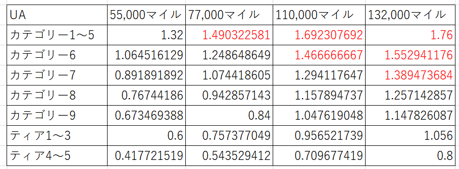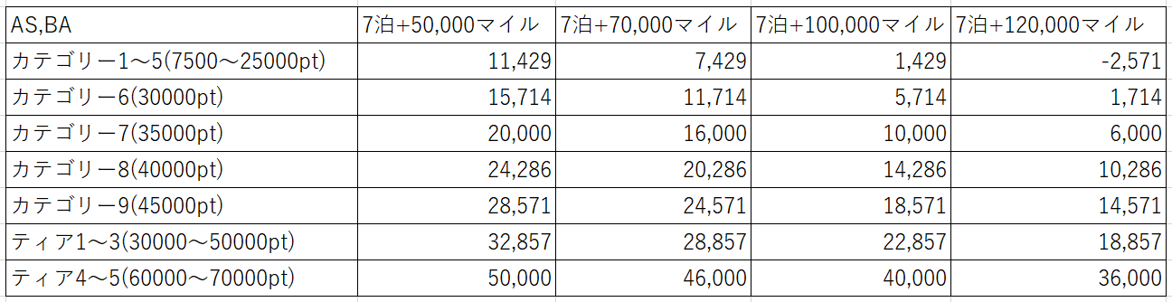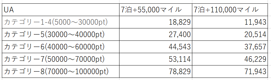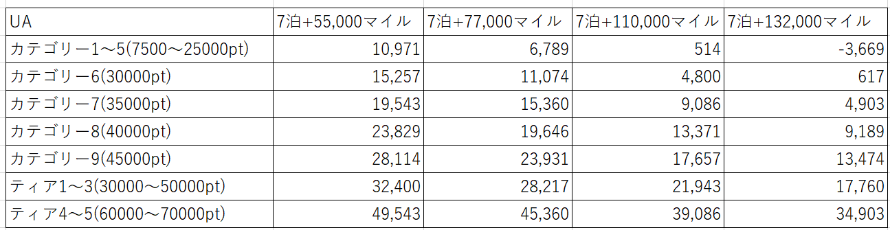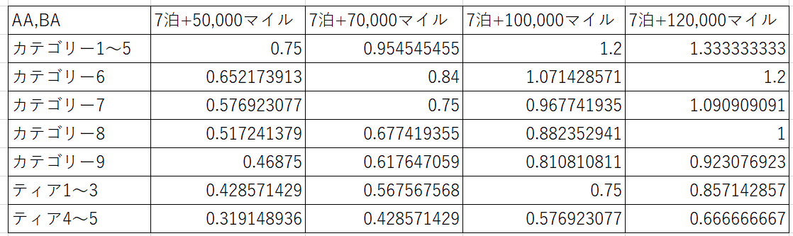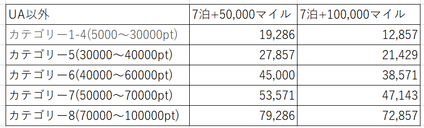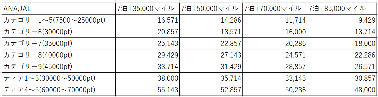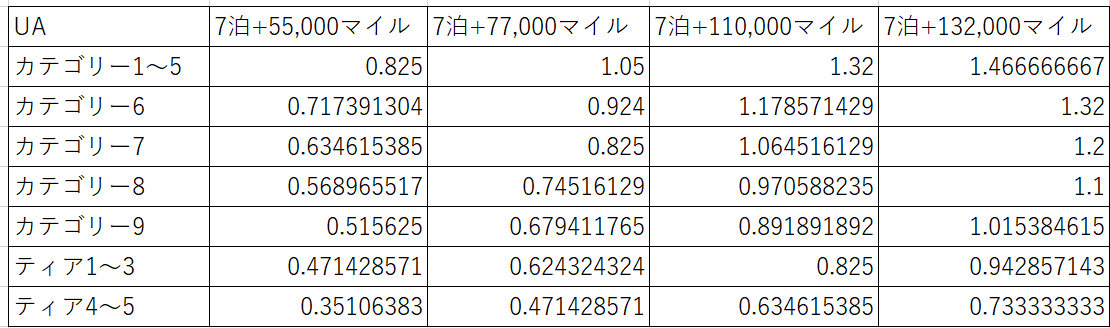ちなみに無料宿泊を全部放棄した場合のマイルの交換比率を計算してみたところ、「カテゴリー1~5」の「7泊+132000マイル」のケースのみがお得でした。