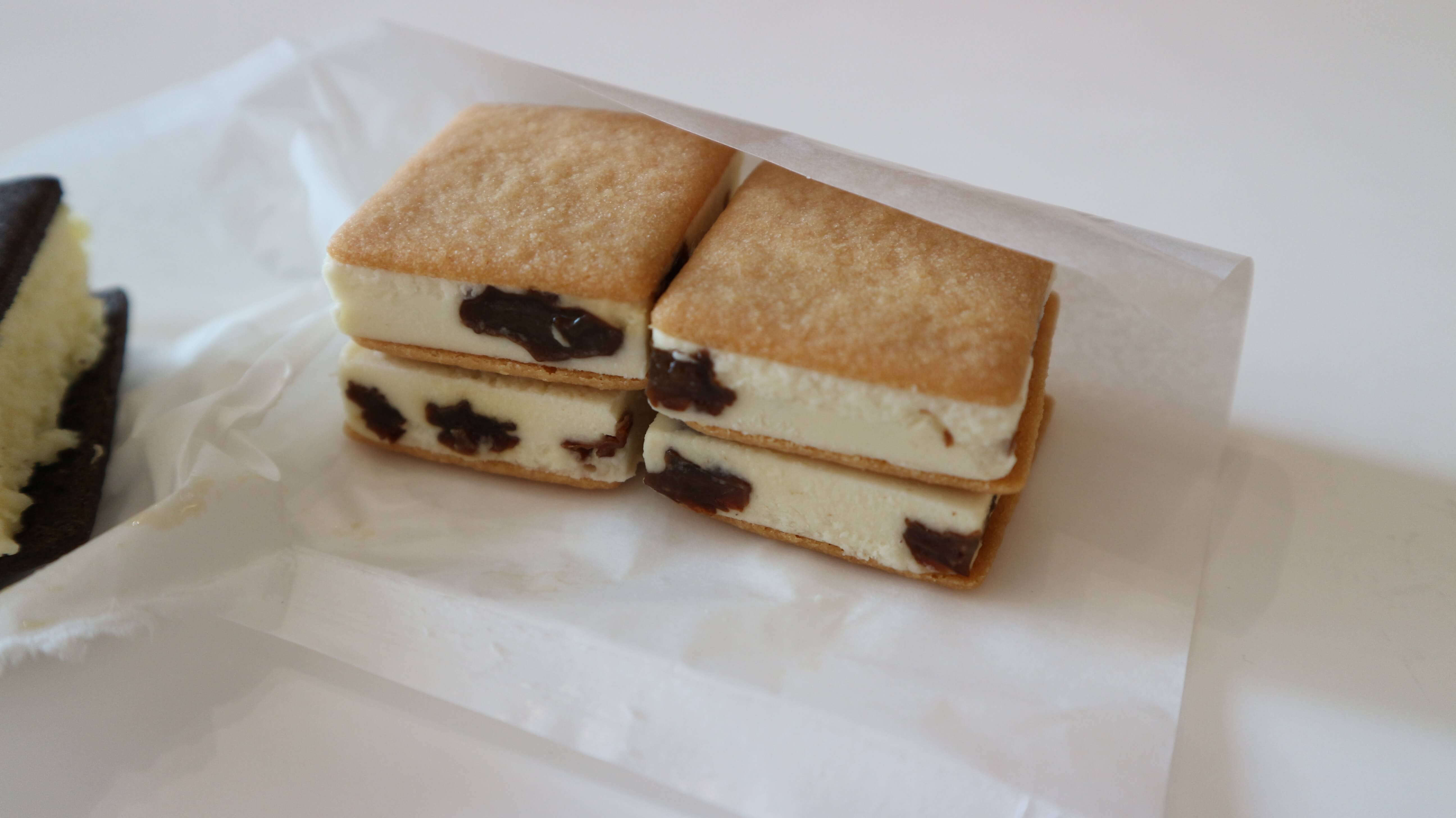 アイスクリームにホワイトチョコレートとレーズンを加え、3枚のビスケットでサンドしていているお菓子です。ビスケットの食感を損なうことがないようにその場でサンドしているそうです。1つ200円です。
