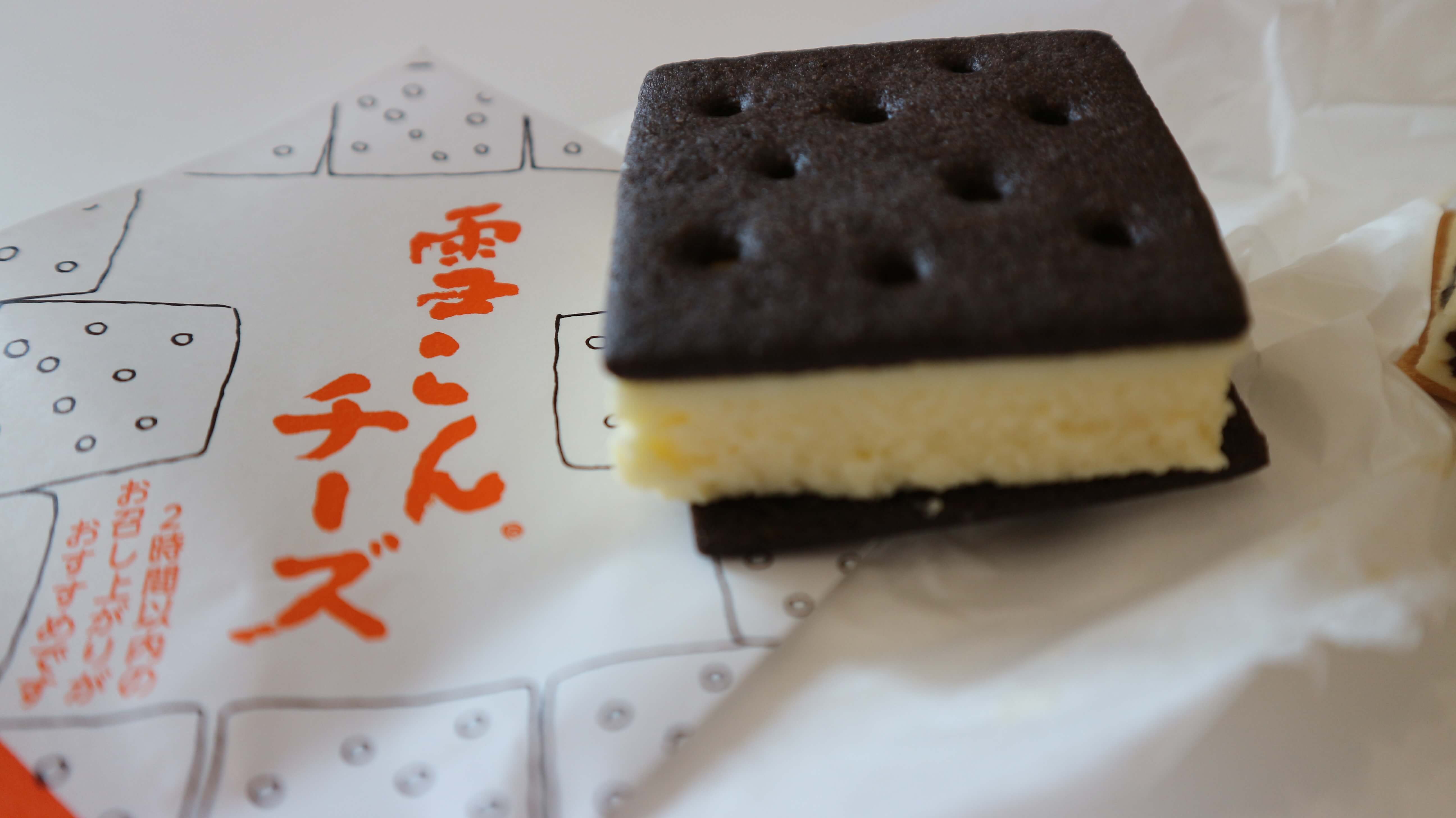 「雪こんチーズ」のココアビスケットは「雪やこんこ」と同じものが使われているのですが、雪こんチーズはホワイトチョコレートの代わりに本格的なベイクドチーズケーキを挟んだものになります。サクサクしたココア入りビスケットの食感が時間経つと共にチーズケーキの水分で失われてしまうため賞味期限は2時間とされています。
