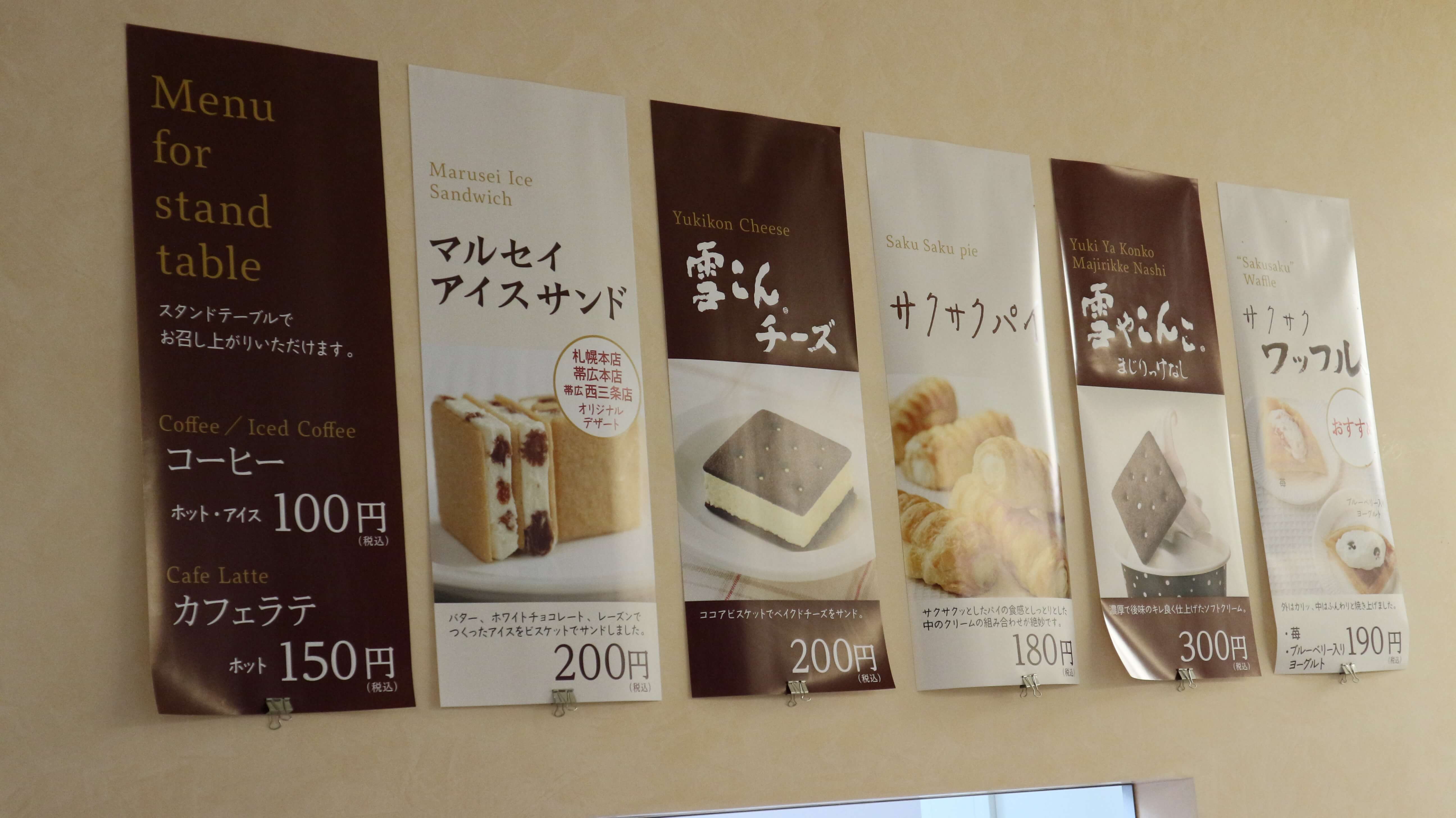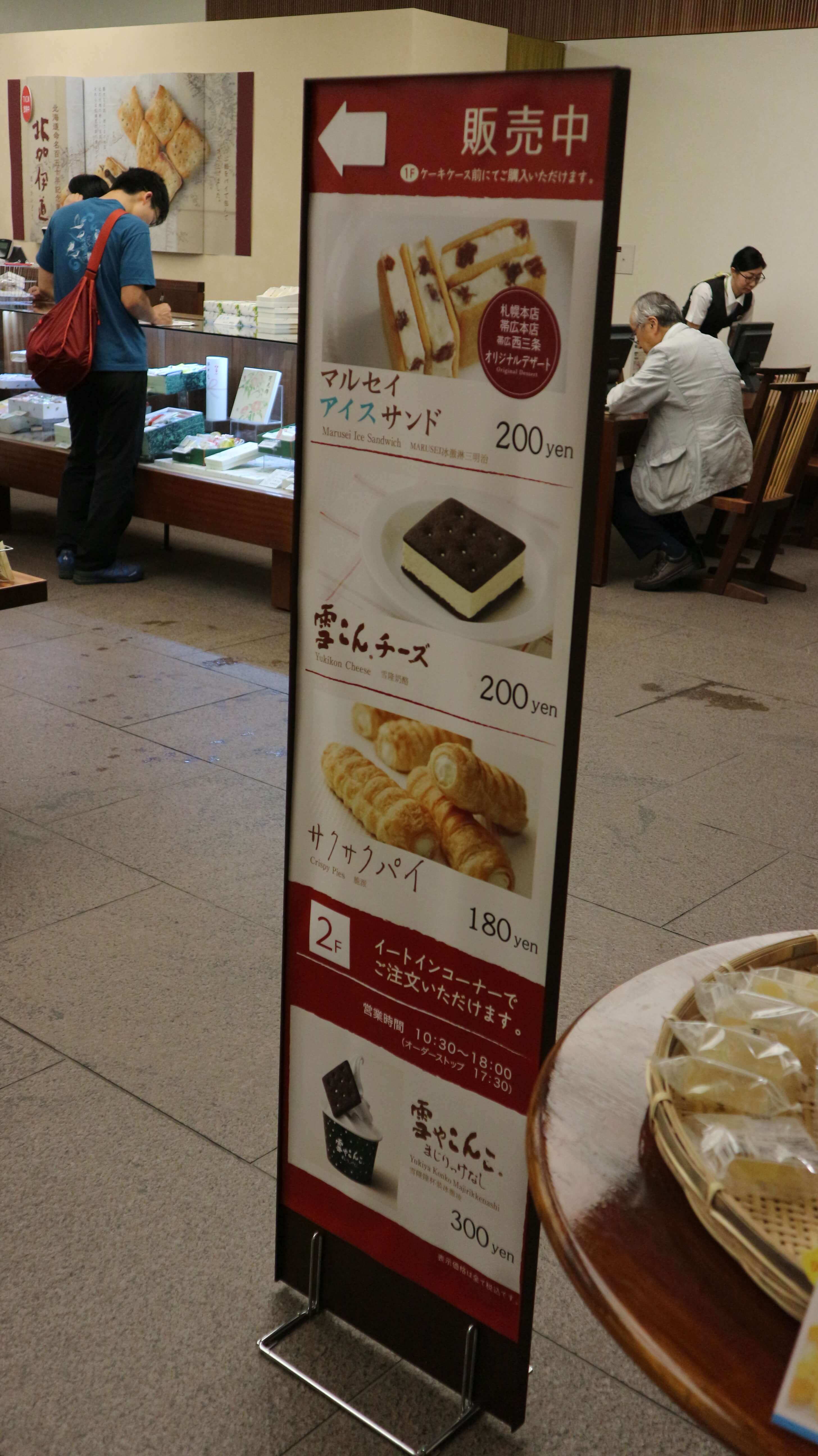 その横にはカウンターがあり、以下の写真のものが購入できるようです。マルセイアイスサンドやサクサクパイ、雪こんチーズが2階でも購入できるようです。またミルクソフトクリームに雪やこんこのブラックココア入りビスケットを乗せた「雪やこんこ まじりっけなし」、「サクサクワッフル」、コーヒーやカフェラテも購入できるようです。