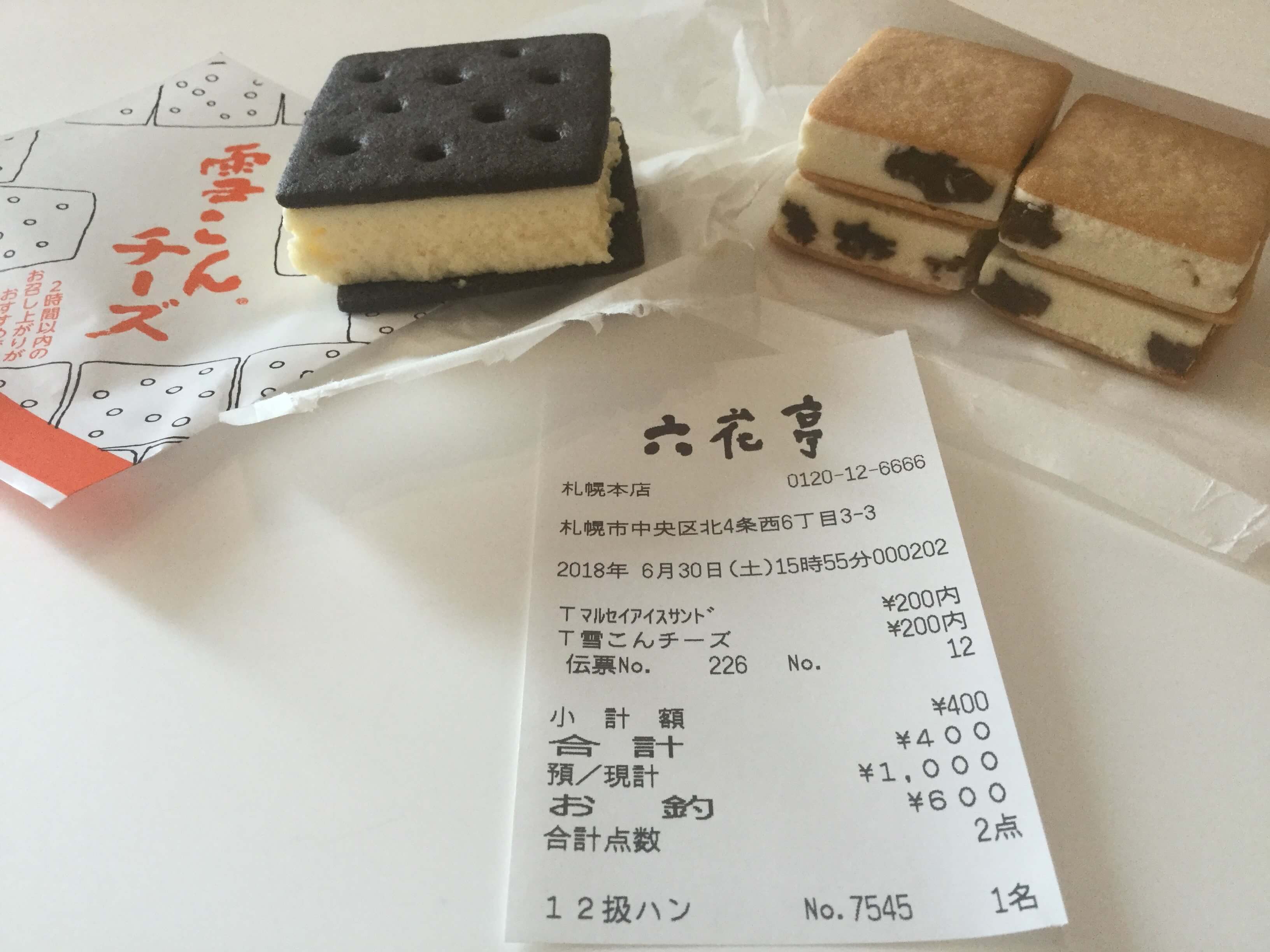 六花亭のお菓子はお土産で頂いたり、北海道物産展でよく購入したりしますが、今回はお土産として持ち帰ることができず北海道でしか食べられない「マルセイアイスサンド」と「雪こんチーズ」を頂きました。特に「マルセイアイスサンド」は札幌本店を含む3店舗でしか食べられないとても貴重なもので「マルセイバターサンド」ファンの私にとっては以前より絶対食べたかったので満足度が非常に高かったです。札幌に行った際には是非召し上がってみて下さい!