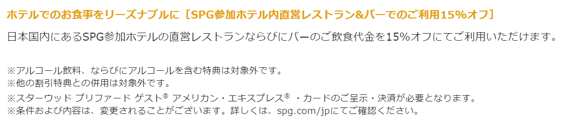 例えばSPG系ホテルではSPGアメックス提示でレストランが15%OFFとなりました。これはあくまでSPGアメックスが提供する特典で、SPGゴールド会員の特典ではありません。このあたりがややこしい…