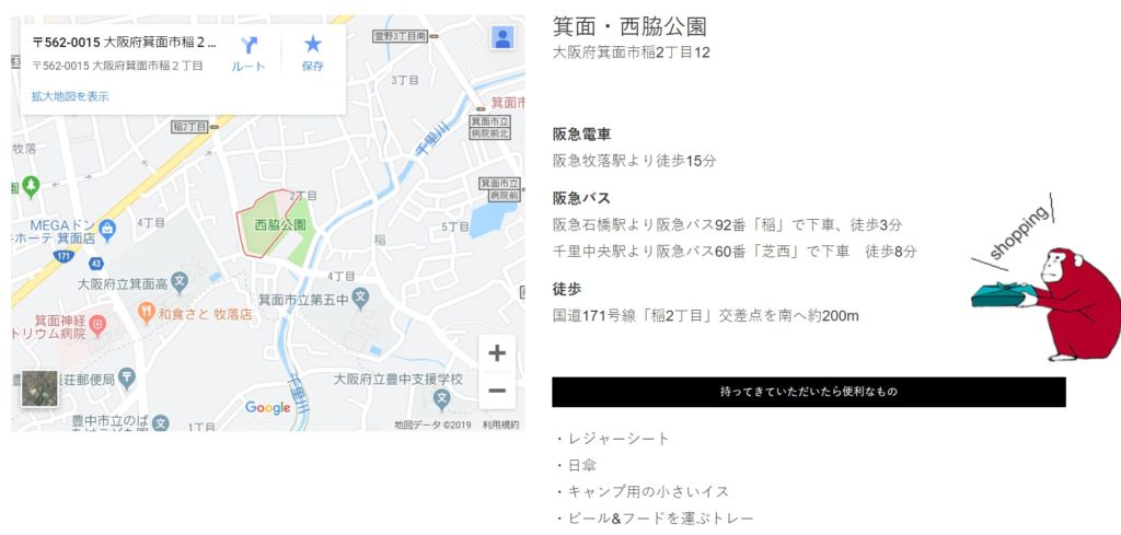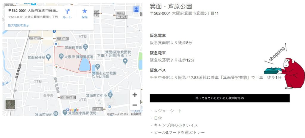それもあってか2019年からは再び会場が移転し、芦原公園となります。こちらの公園は阪急・箕面駅から徒歩圏内ですので電車でのアクセスは改善ですね。しかも、上下の地図を見ると会場の面積も広くなってそうですので混雑も緩和されますかね。