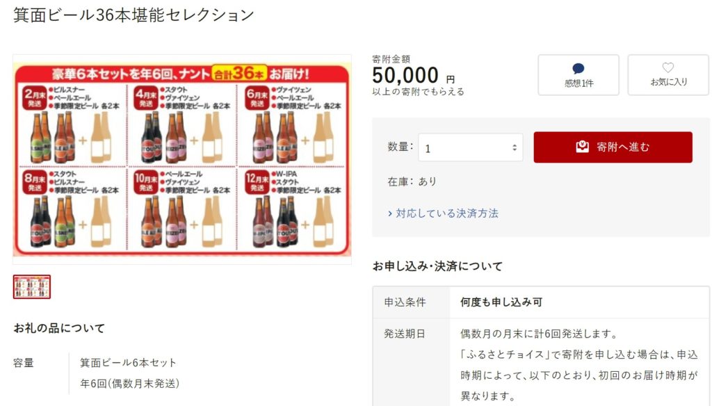 50000円寄付すると何と「箕面ビール36本堪能セレクション」