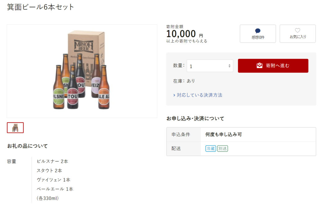 10000円の寄付で箕面ビール6本セットが返礼品として頂けます