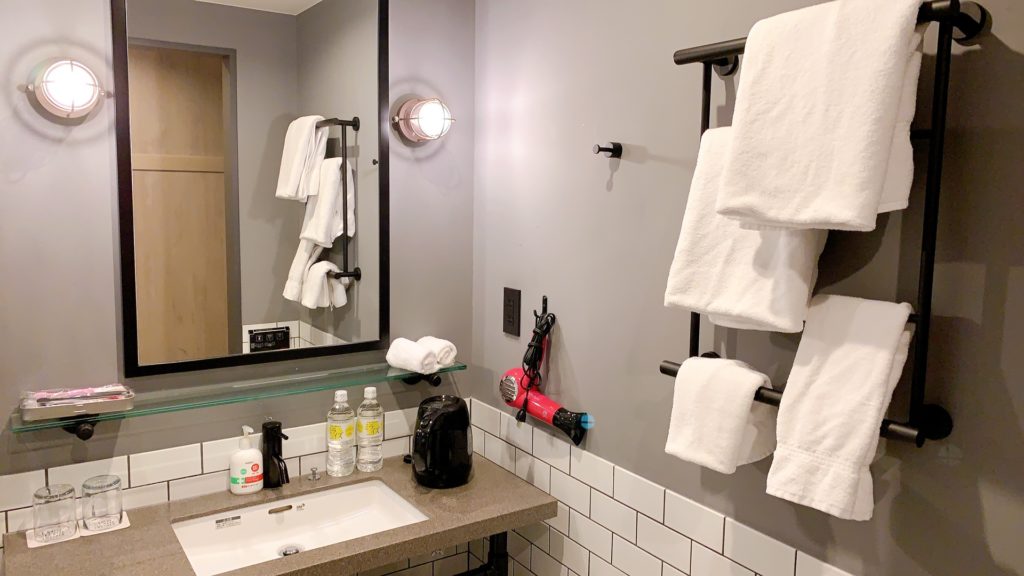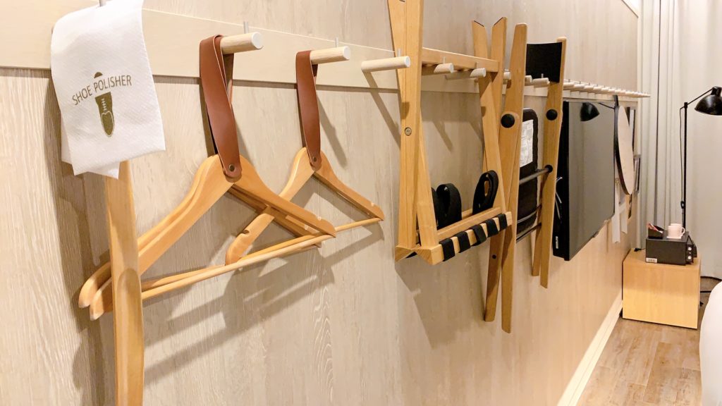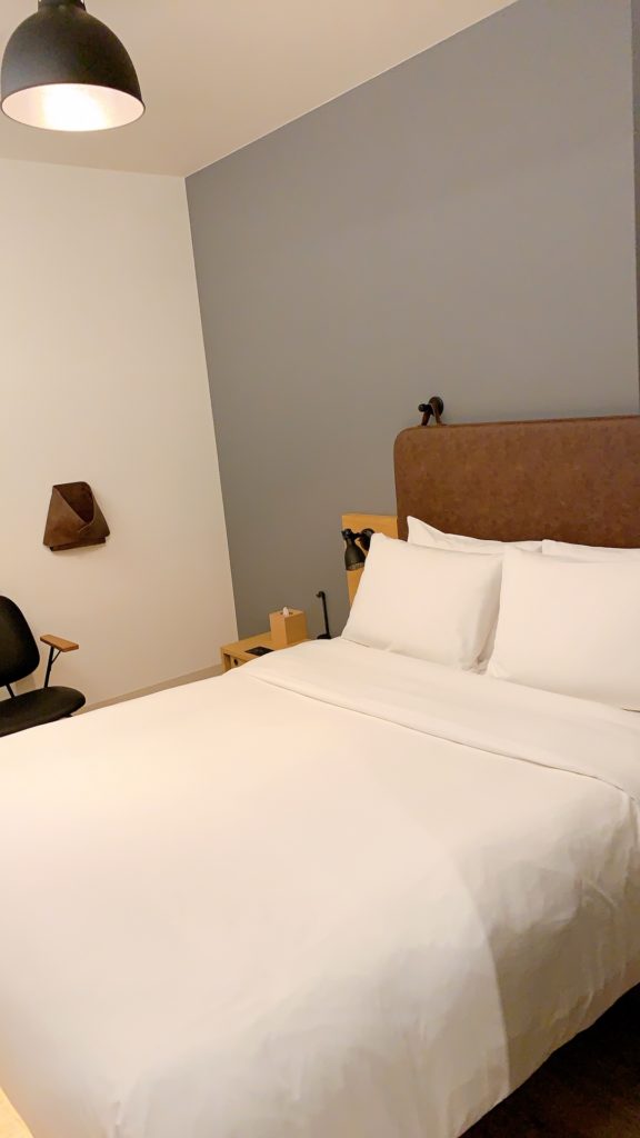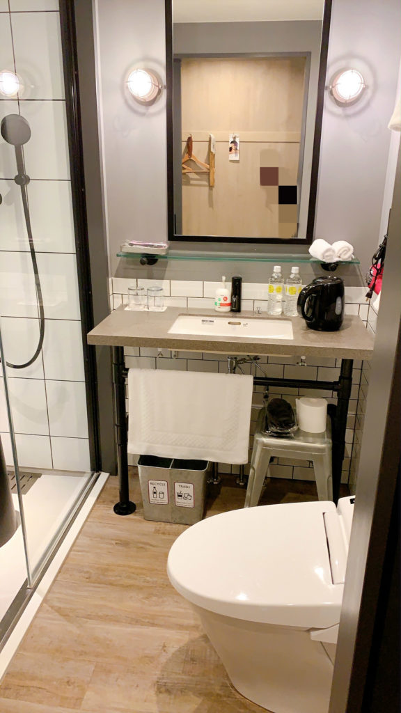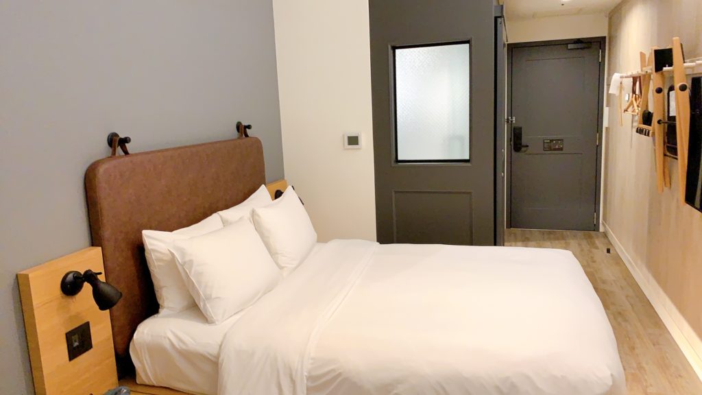 部屋の奥から入口側を見るとこのような感じです。ガラスの部分がシャワーブースです。ベッドの上にパジャマは置かれておらず、最初に宿泊した時はめちゃくちゃ探しました(笑)。パジャマは部屋には置かれていませんのでフロントでもらう必要があります。