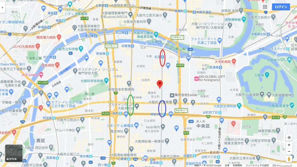 しかしながら現在御堂筋線本町駅(地図の緑丸)は工事の影響で2022年6月頃まで1番出口が利用できませんので御堂筋を渡った2番出口あるいは1番出口のやや南にある3番出口が最寄りとなります。