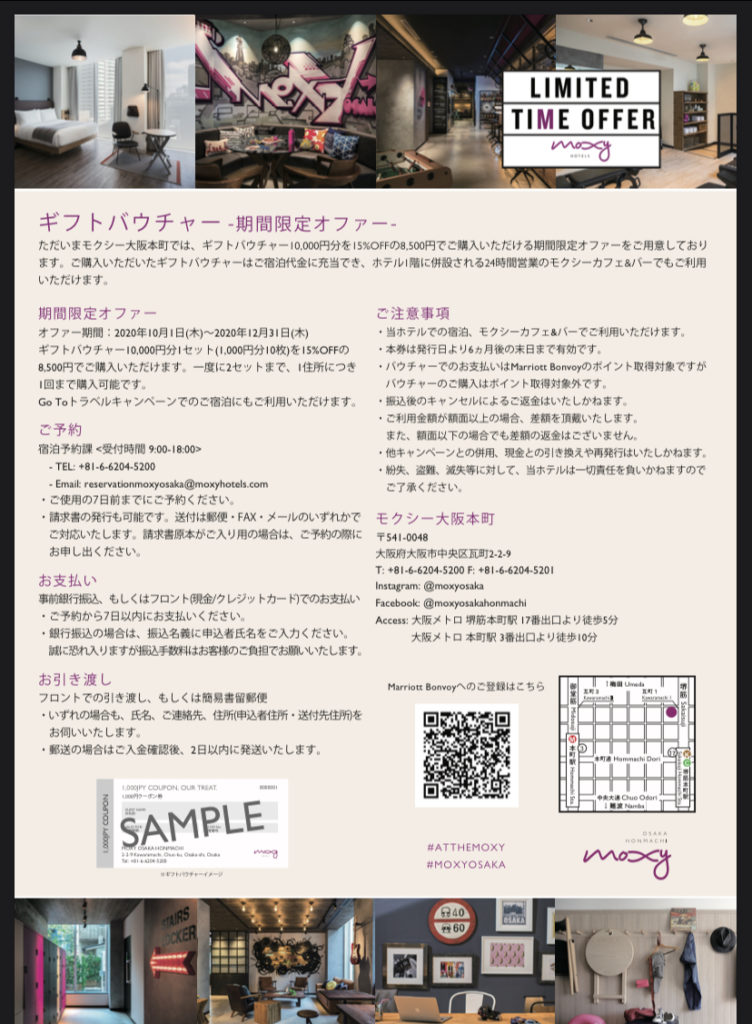 モクシー大阪本町でも10,000円分のバウチャーを15%割引の8,500円で購入することが可能です。