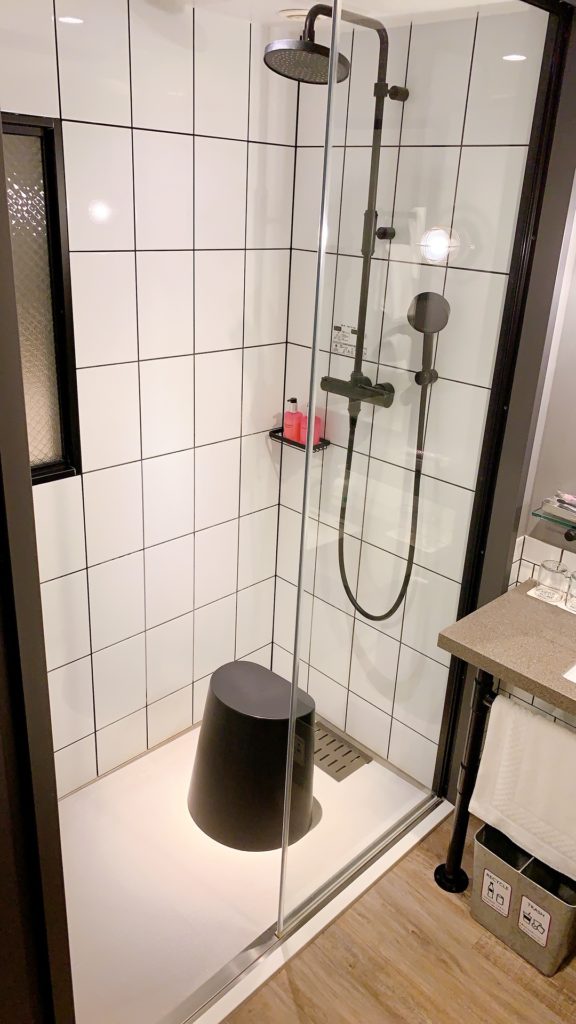 狭い割にはレインシャワーもハンドシャワーもあり、椅子もあります。アメニティはリンスインシャンプーとボディソープです。