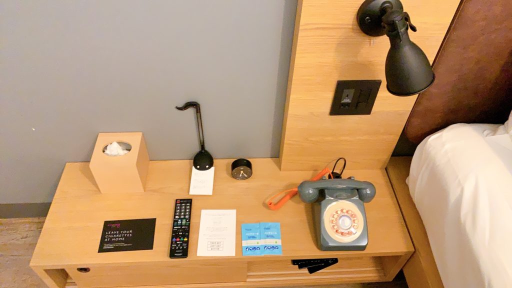 枕元にはコンセント1口とUSBコンセント1口があります。電話や時計、ティッシュが置かれています。このご時世ですのでアルコール除菌シートも置かれています。