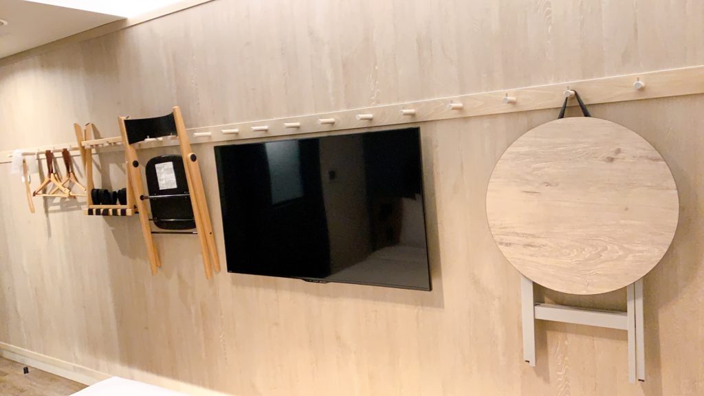 スペースを活かすため椅子やテーブルは壁にかけられています。クローゼットもありません。