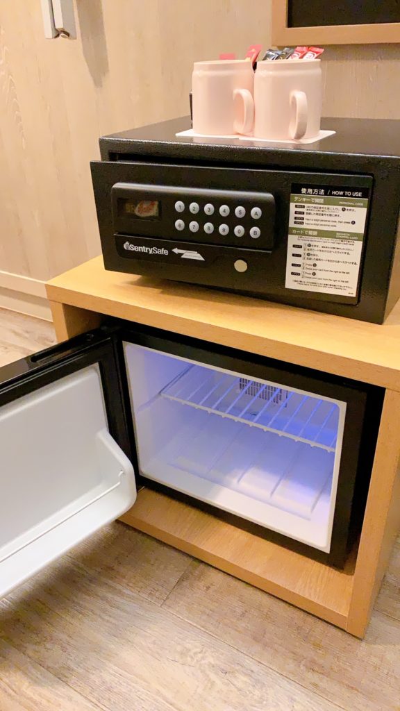 部屋の隅には冷蔵庫とセーフティボックスがあります