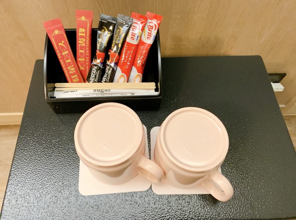 セーフティボックスの上には無料のコーヒー、紅茶とマグカップが置かれています