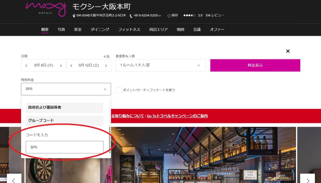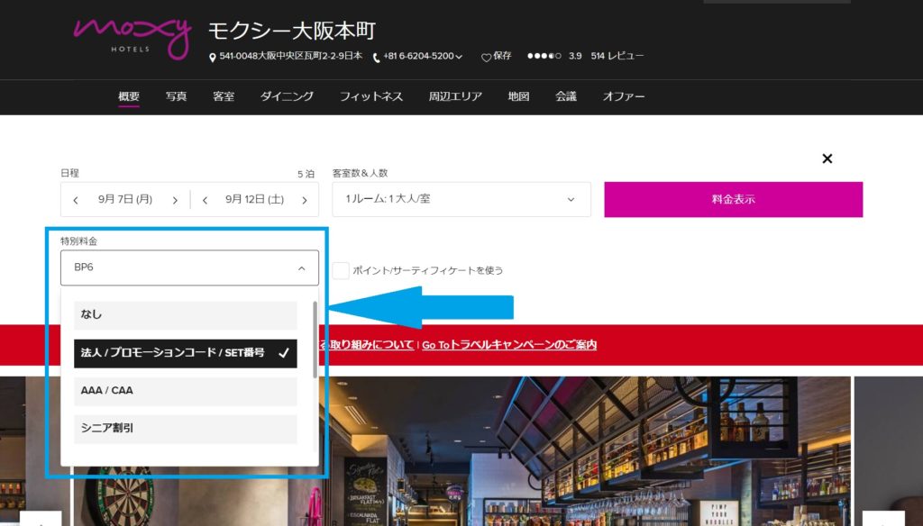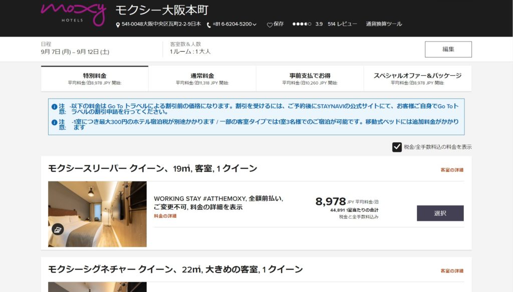 この5泊あるいは15泊の宿泊は有償宿泊である必要があります。今回のモクシー大阪本町の割引プランは上手く利用すればGo Toキャンペーンを利用すると15泊で9万円台が可能です。ステータスマッチ後にプラチナステータスを維持したい場合に利用できそうです。