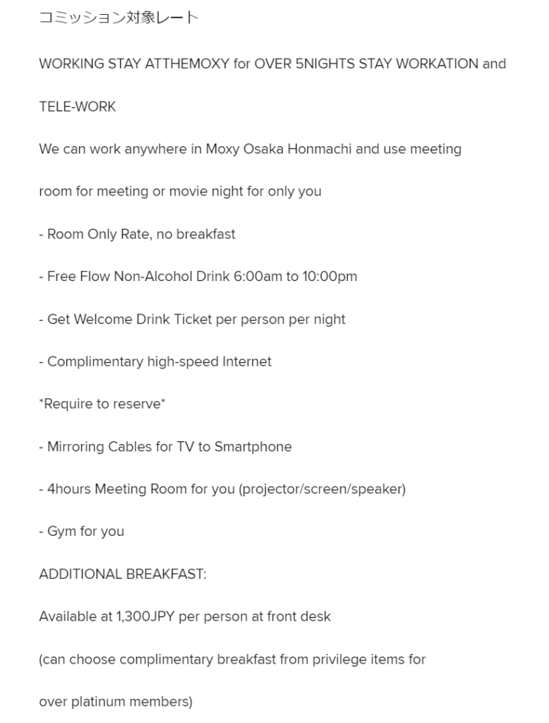 モクシー大阪本町の30~50%割引プラン「Working Stay #atthemoxy」は素泊まりのプランなのでしょうか?特典などプランの内容を確認します。