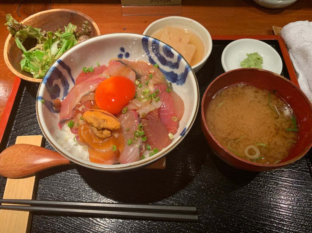 海鮮丼はウニやいくらも含んだ7~8種類程度の刺身が載っています!なんだかキラキラしてますね。パッと見て「刺身の玉手箱や~」という言葉と、言いそうな人の顔が思い浮かびました(笑)