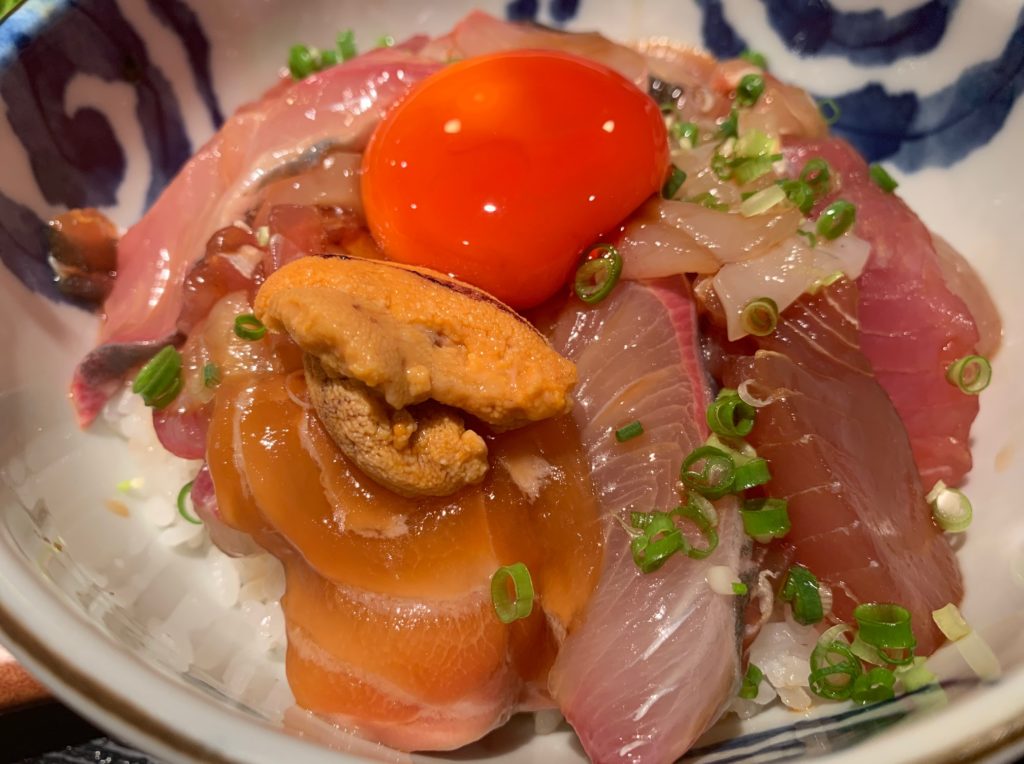 最初は卵黄を崩さずに頂きます。刺身は全て漬けになっています。新鮮ながらねっとりとした食感で美味しいです。三分の一程度食べたところで卵黄を崩して食べましたが、まろやかになりまた違った感じになります。