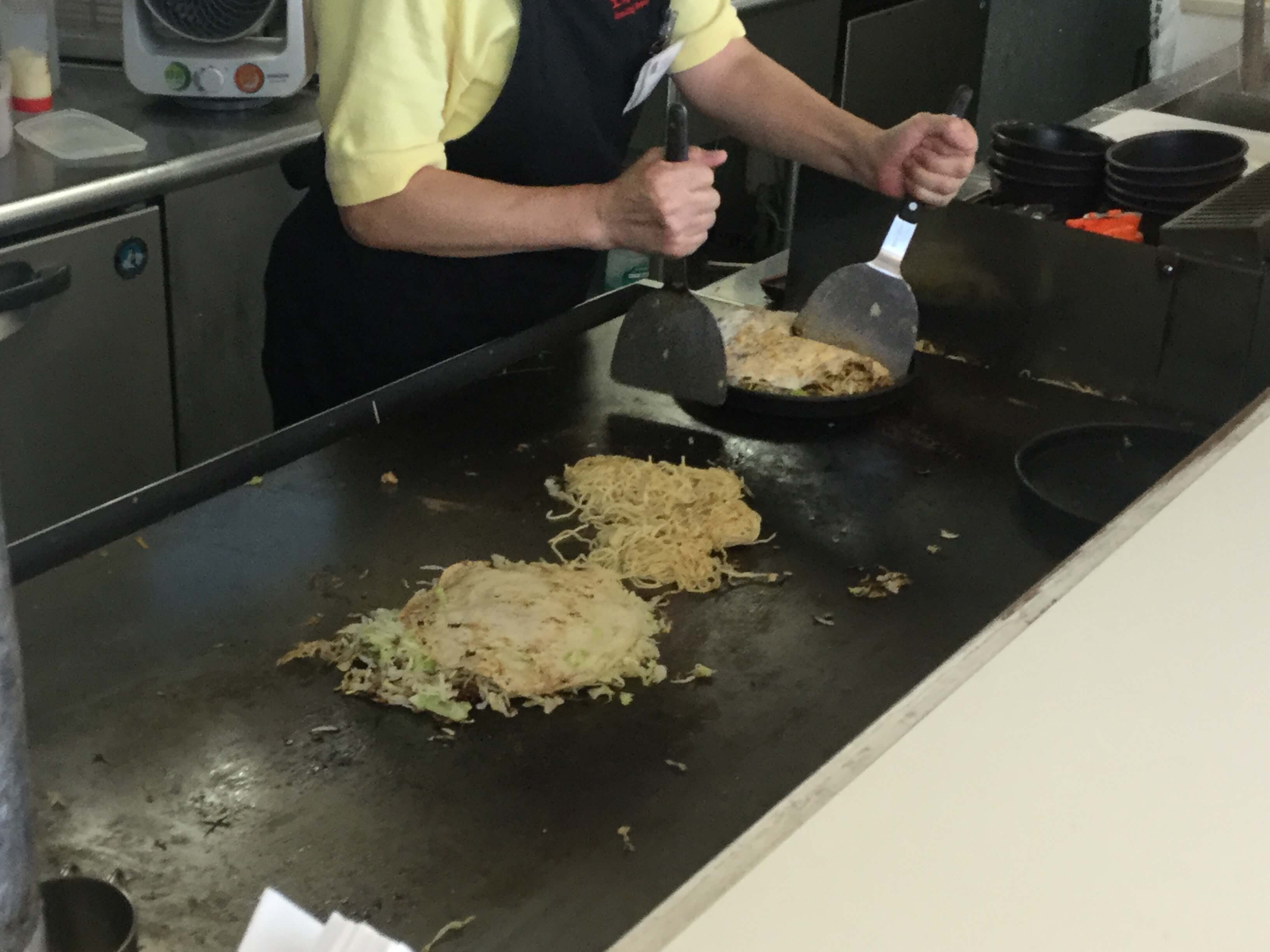 このように店員さんが手際よく鉄板でお好み焼き(広島焼)をどんどん焼いておられます。提供までは10分程度かかりますので時間に余裕をみる必要があります。