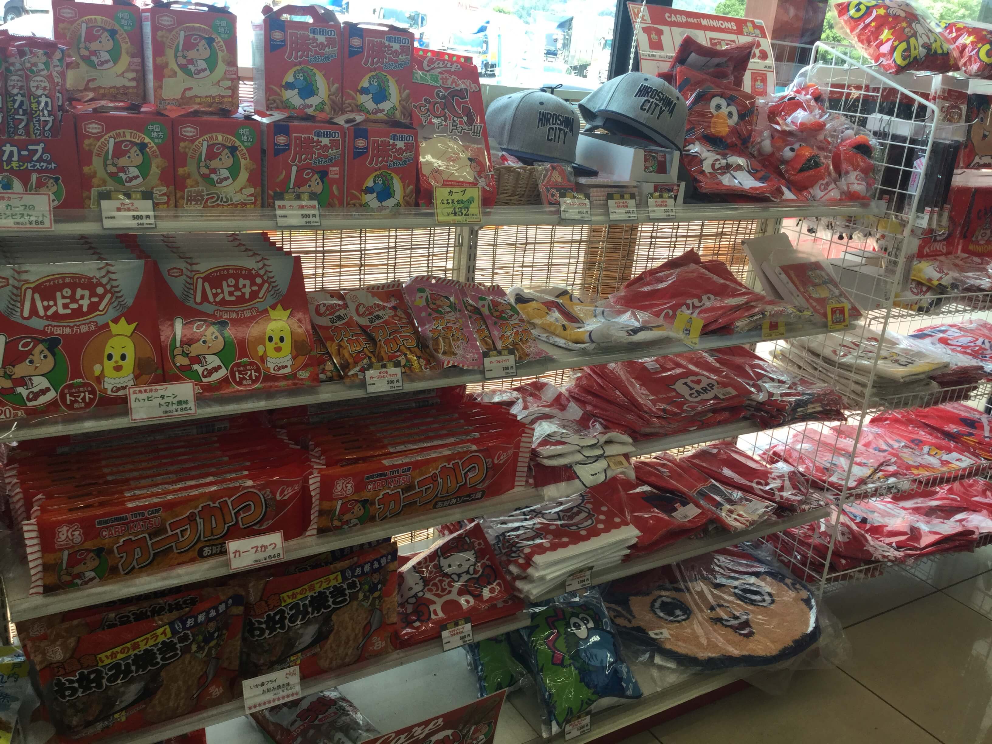 こちらでは通常コンビニに置かれているような商品だけでなく広島カープグッズや広島土産もたくさん売られています。
