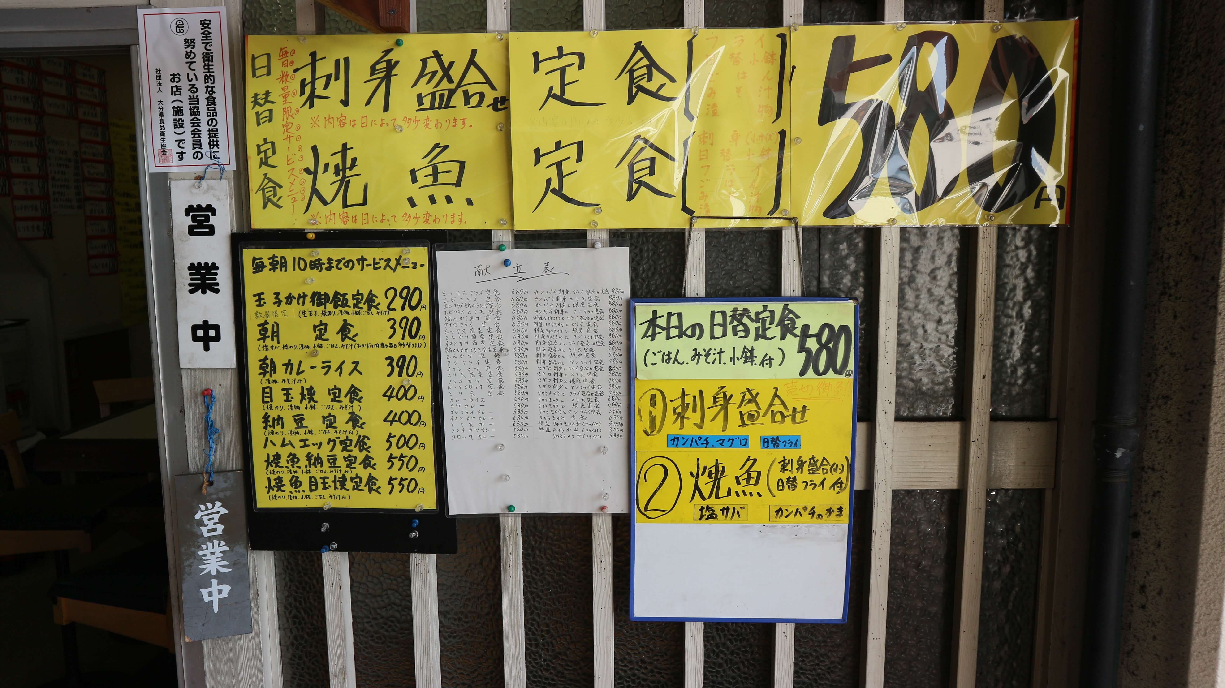 朝は破格の290円の玉子かけ御飯定食(生玉子、焼きのり、漬物、小鉢、ごはん、味噌汁)や390円の朝定食(塩サバ、焼きのり、漬物、小鉢、ごはん、味噌汁)もありますが、やはり刺身盛り合わせ定食(580円)に目が行きましたのでこちらを注文しました。