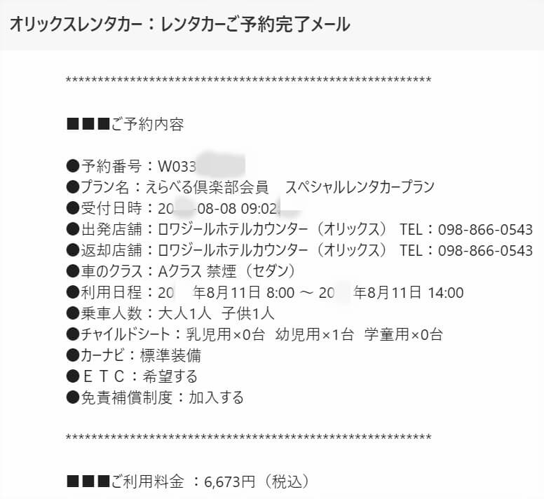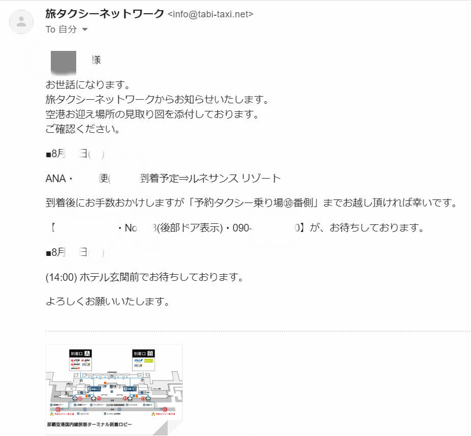 ホームページから申し込むとメールでやり取りをして申し込みが完了します。そして数日前に下記のように担当のタクシー、運転手さんの連絡先、集合場所が記載された確認メールがやってきます。