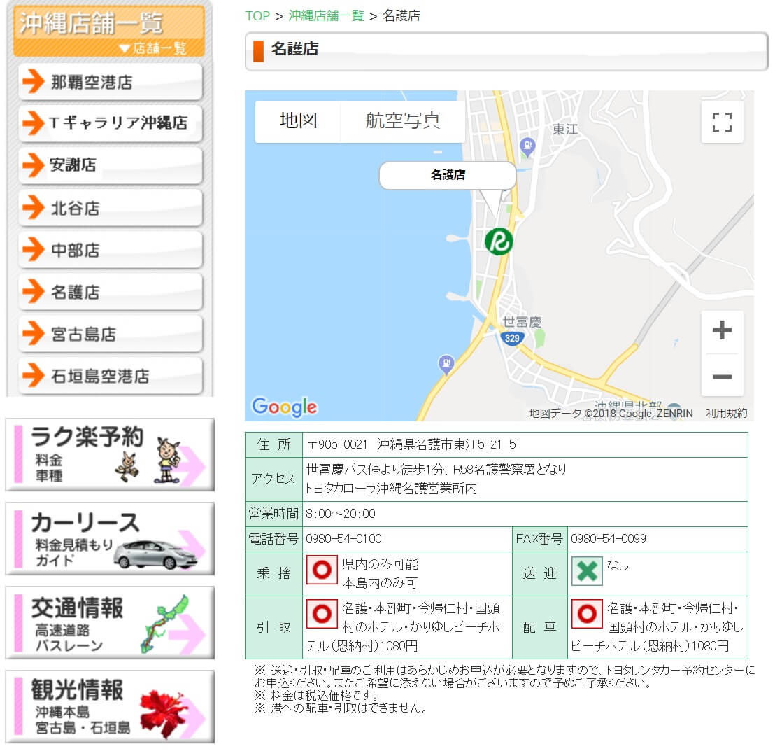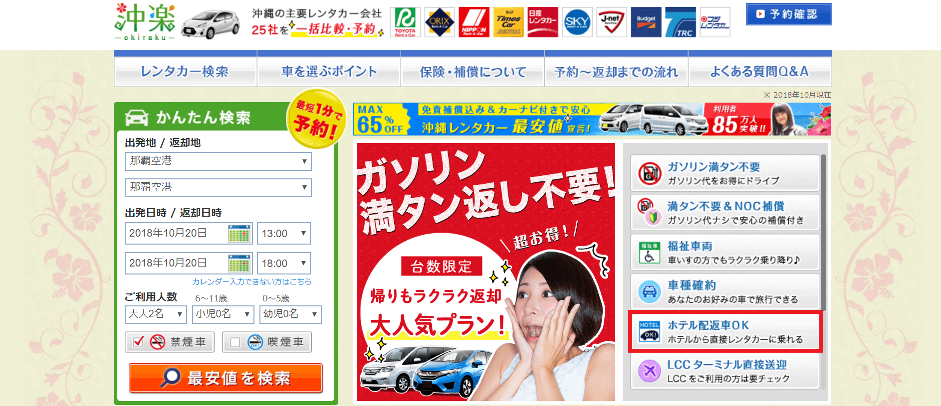 他にも沖楽レンタカーという一括レンタカー検索サービスでも下の画像の右下赤四角で囲っているようにホテル配車サービスを検索できます。