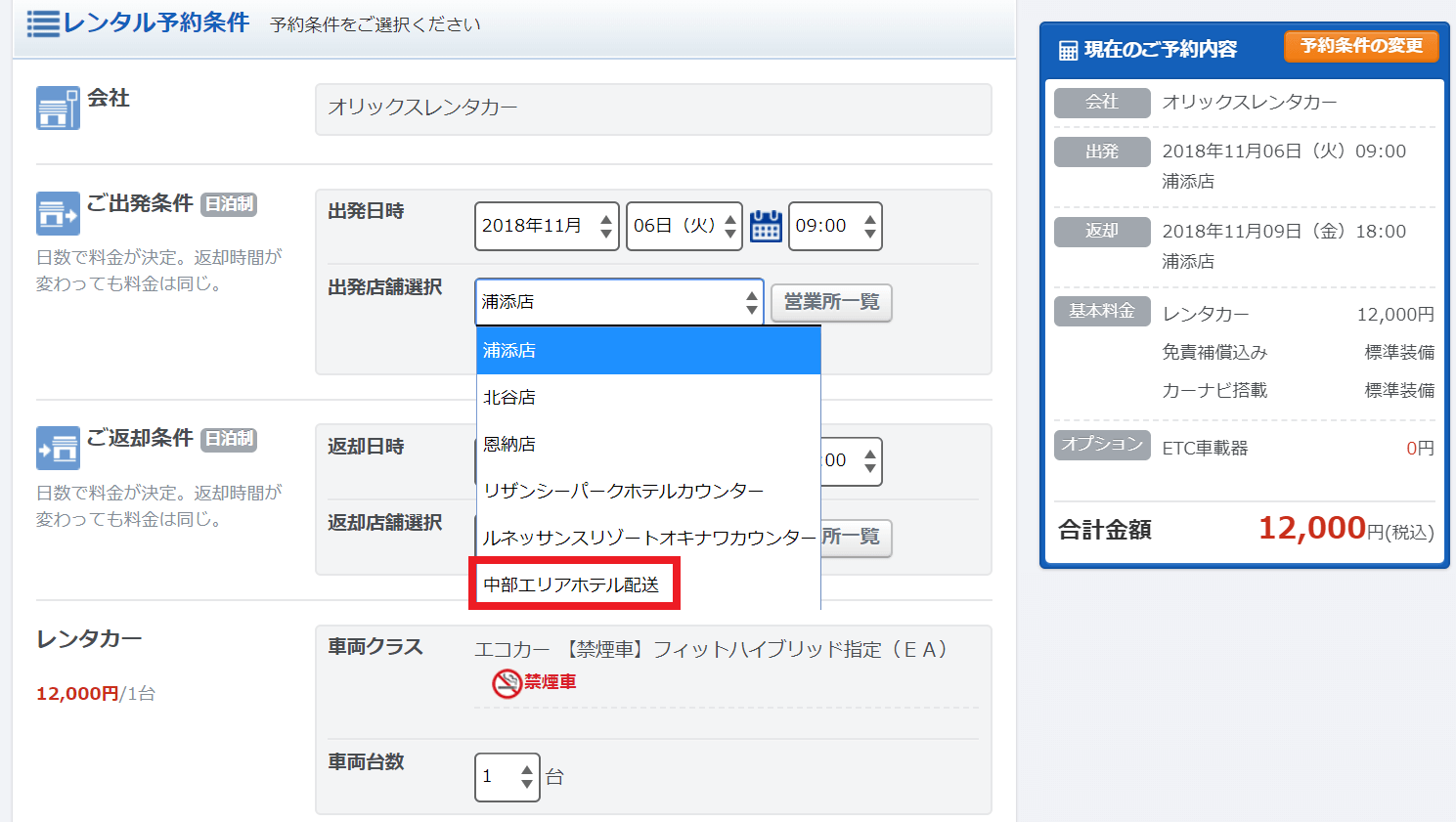 以下の画像の赤四角で囲った部分のように予約時に出発・返却店舗を選ぶ際に「ホテル配送」という選択が可能です。これがホテル配車・乗り捨てサービスとなります。