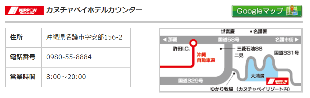 例えばカヌチャリゾートにはニッポンレンタカーのカウンターがあります
