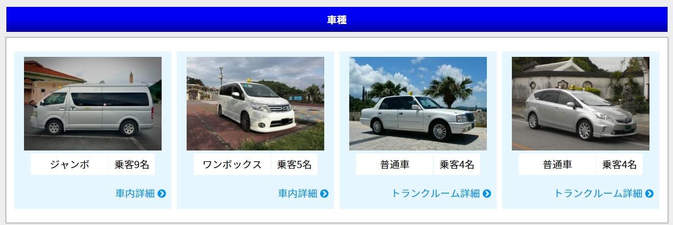 車種は「普通車」「ワンボックス」「ジャンボ」と3種類から選択可能です。人数や荷物の量を考えて選択しましょう!