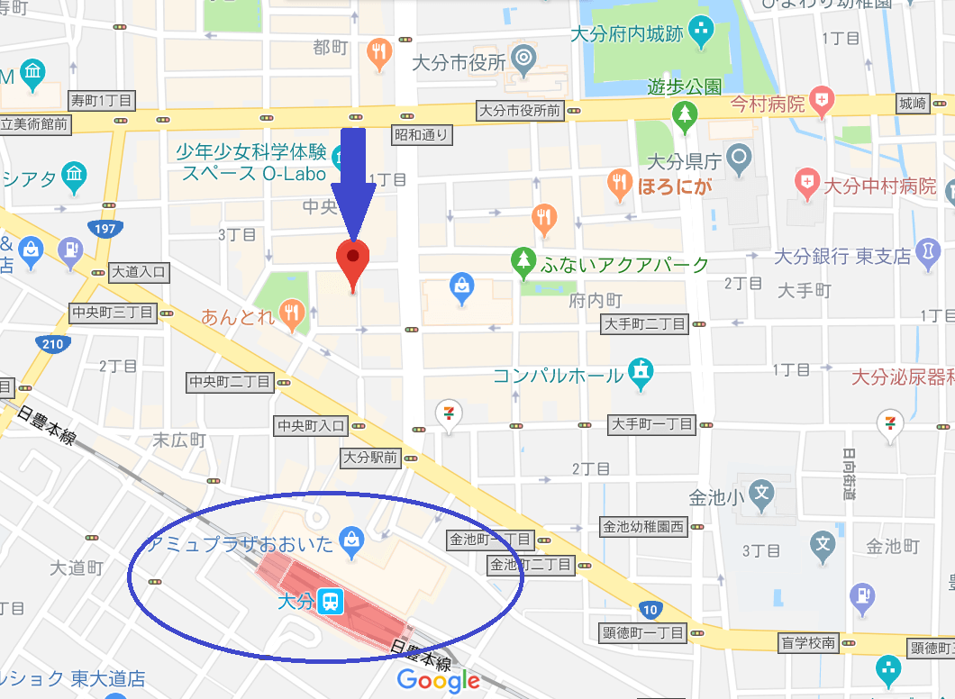 下の地図の下の丸で囲った部分が大分駅、青矢印の部分にあるのが「寿司ろばた八條」です。