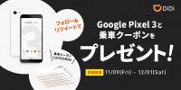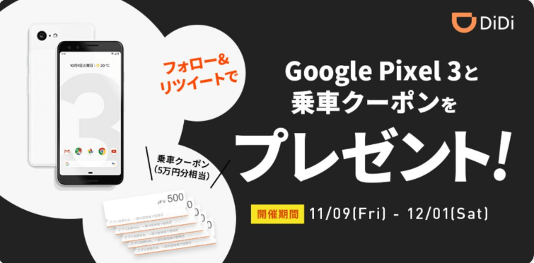 Twitterで@DidiJapanをフォローし、下の投稿をリツイートすると抽選で5名にGoogle Pixel 3と5万円分のDiDi乗車クーポンをプレゼントというキャンペーンが開催されています。12/1までに以下のツイートからフォロー&リツイートをしましょう!