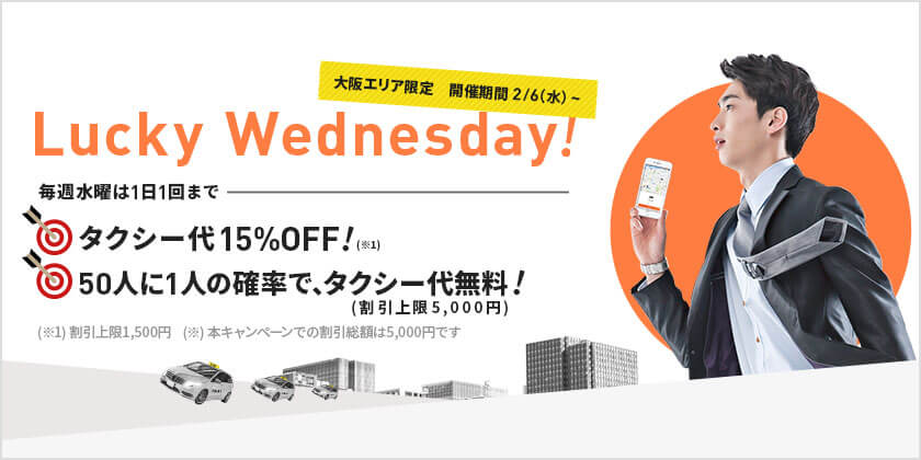 毎週水曜日は誰でもタクシー代が15%OFF!(割引上限1,500円)さらに50人に1人の確率でタクシー代が無料!(割引上限5,000円)となるキャンペーンです