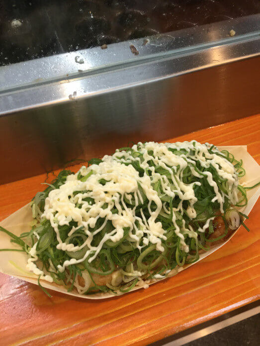 たこ焼きを覆い尽くすほど山盛りにねぎが盛られており見た目もインパクトが大きいです。
