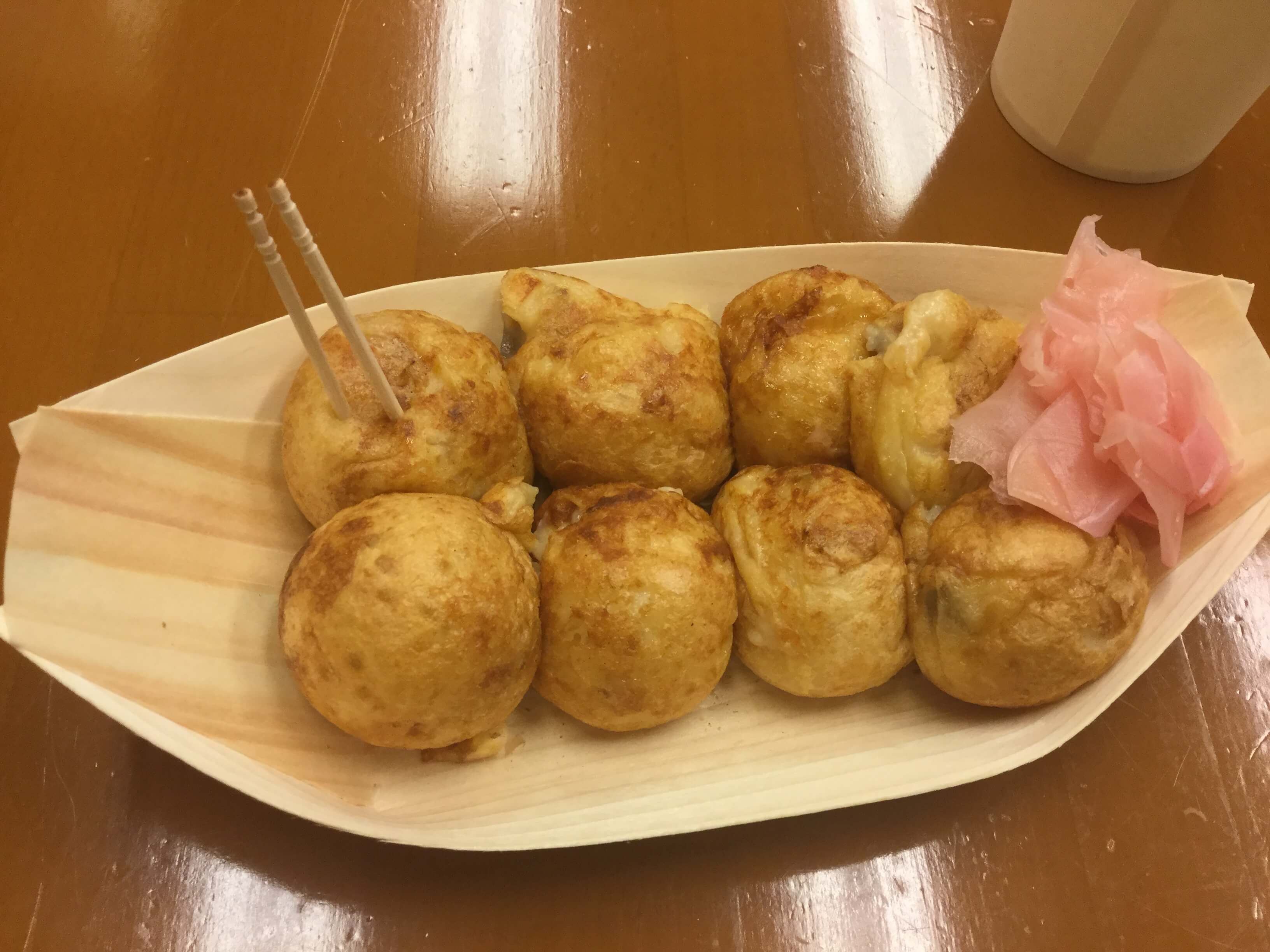 小さめのたこ焼きで生地は味がしっかりついており何もつけなくてもとてもおいしいです。玉子がたっぷり使われているのでフワフワです。日によってはトロトロでお箸でうまくつまめないほどです。つまようじが2本ついているのはフワフワで1本だと崩れてしまうからだとか。甘酢ショウガが別添えでお口直しにいい感じです。なかなかいかない場所ではありますが、ここのたこ焼きを食べるためにわざわざ長居まで行く価値はあるかと思います。