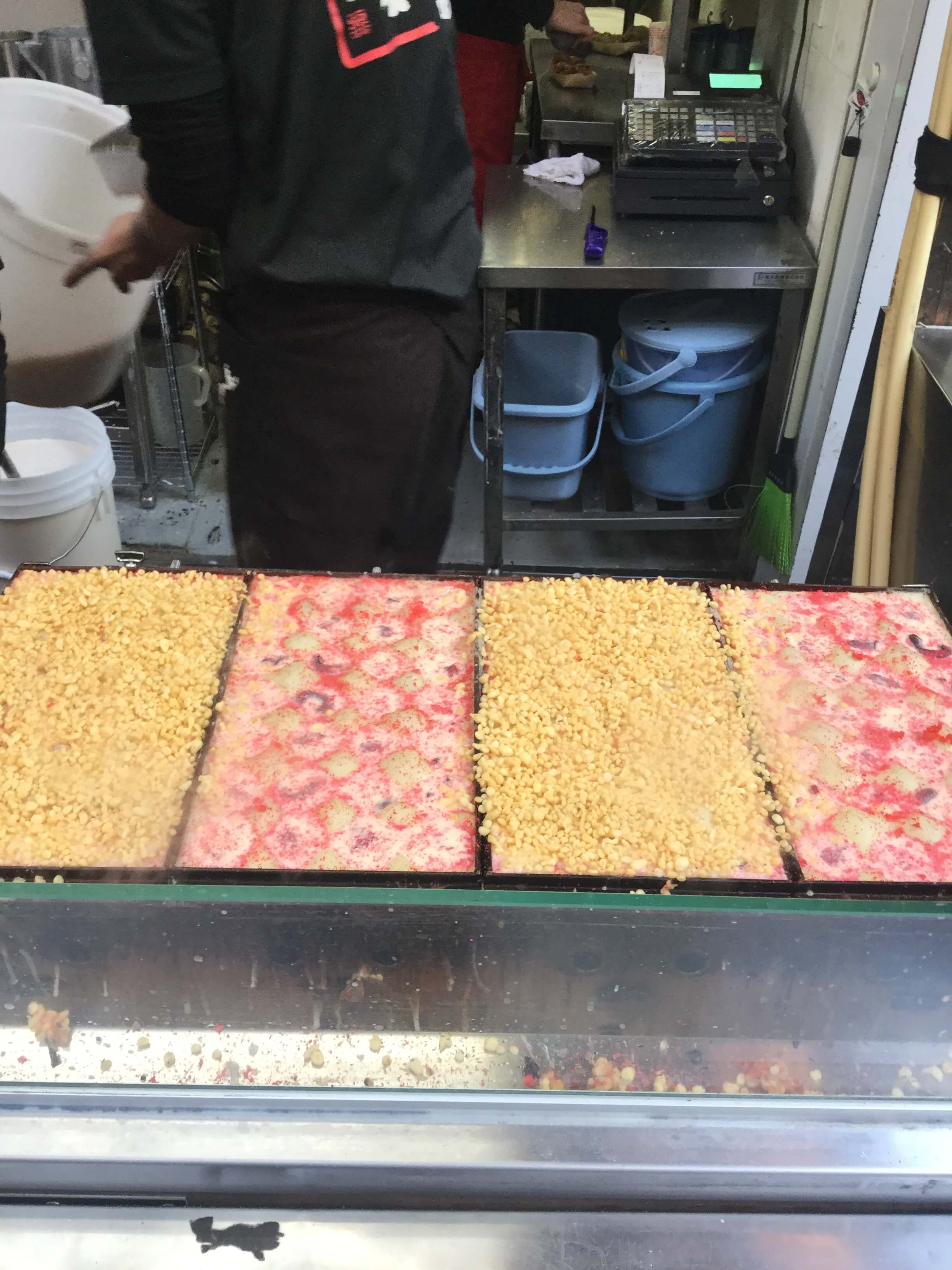 JR・大阪市営地下鉄天王寺駅、近鉄阿部野橋駅から歩いて数分の今や観光名所となったあべのハルカスのすぐ南側にあります。本店はイートインスペースがなく、以前はお店の前の近鉄百貨店のところに腰かけて食べたものですが、ハルカスになってからこんな風になり食べられなくなりました。