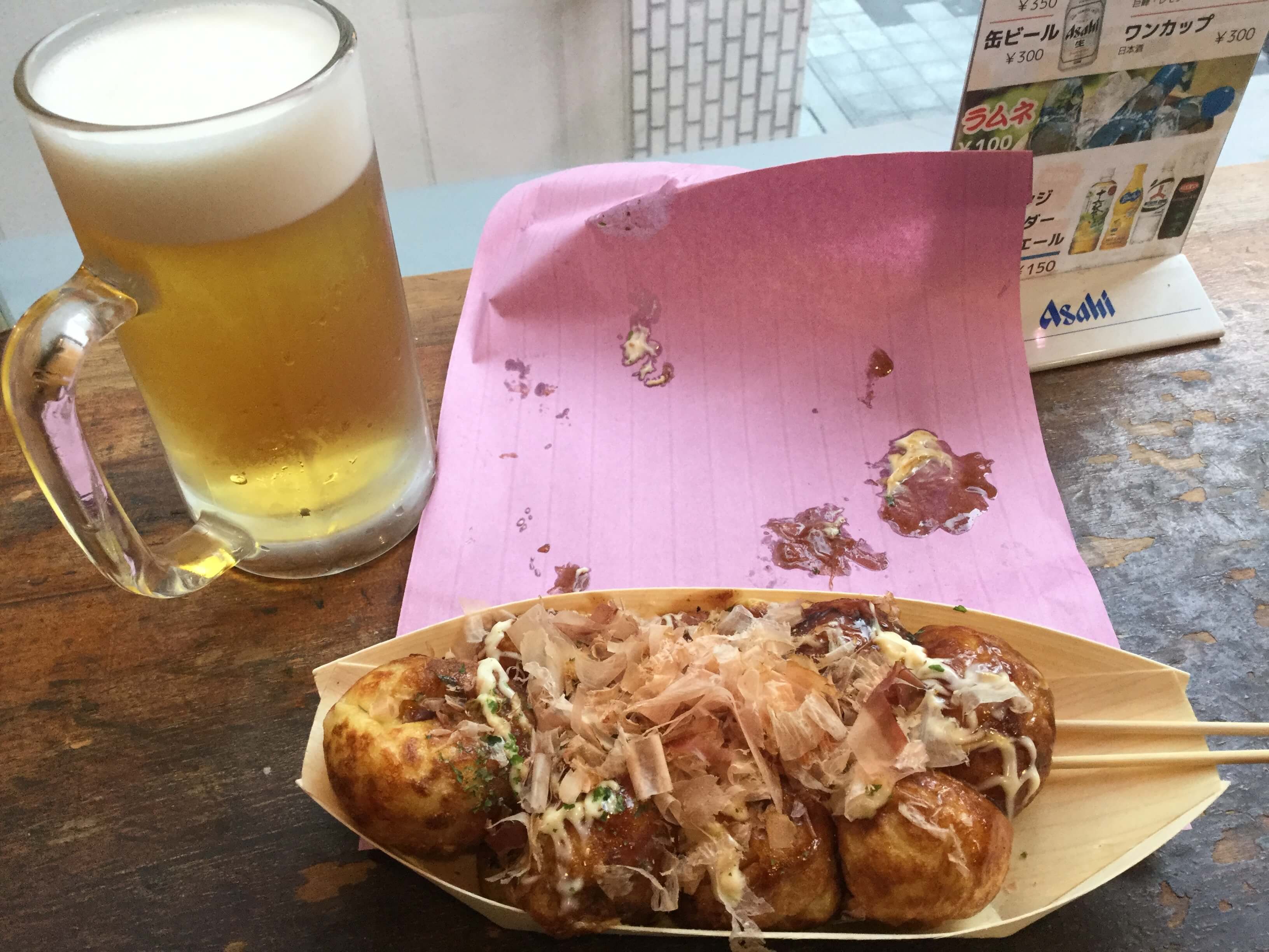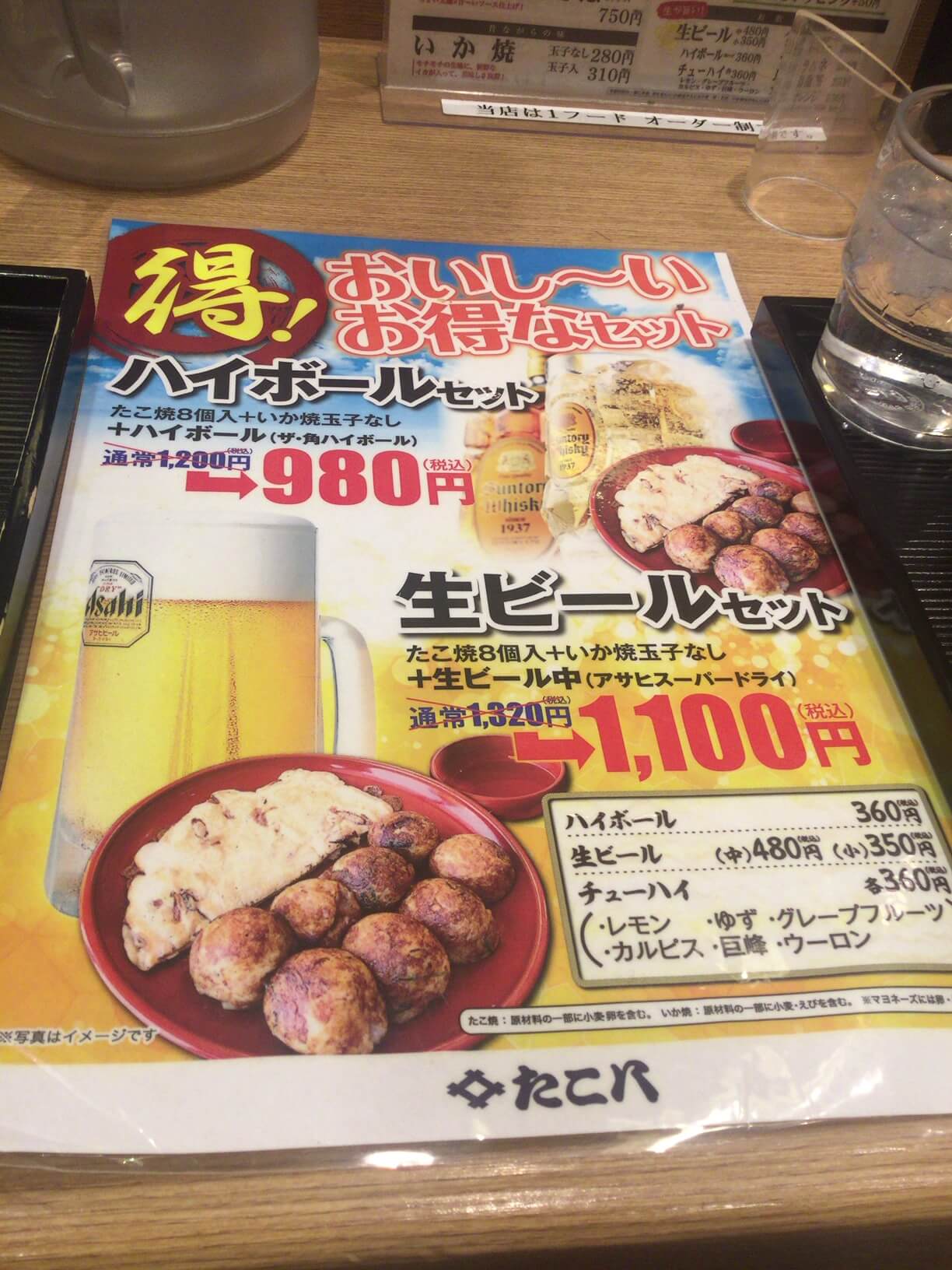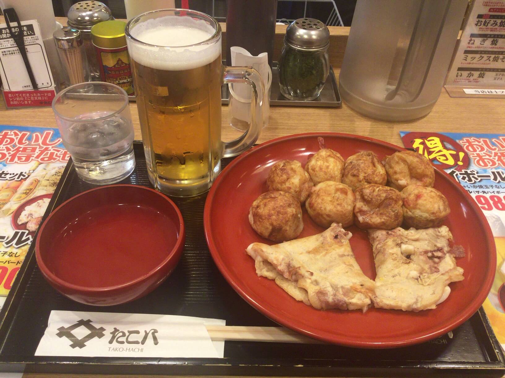 僕はこの日は生ビールセット(たこ焼8個+いか焼き玉子なし+生ビール中)を注文しました!