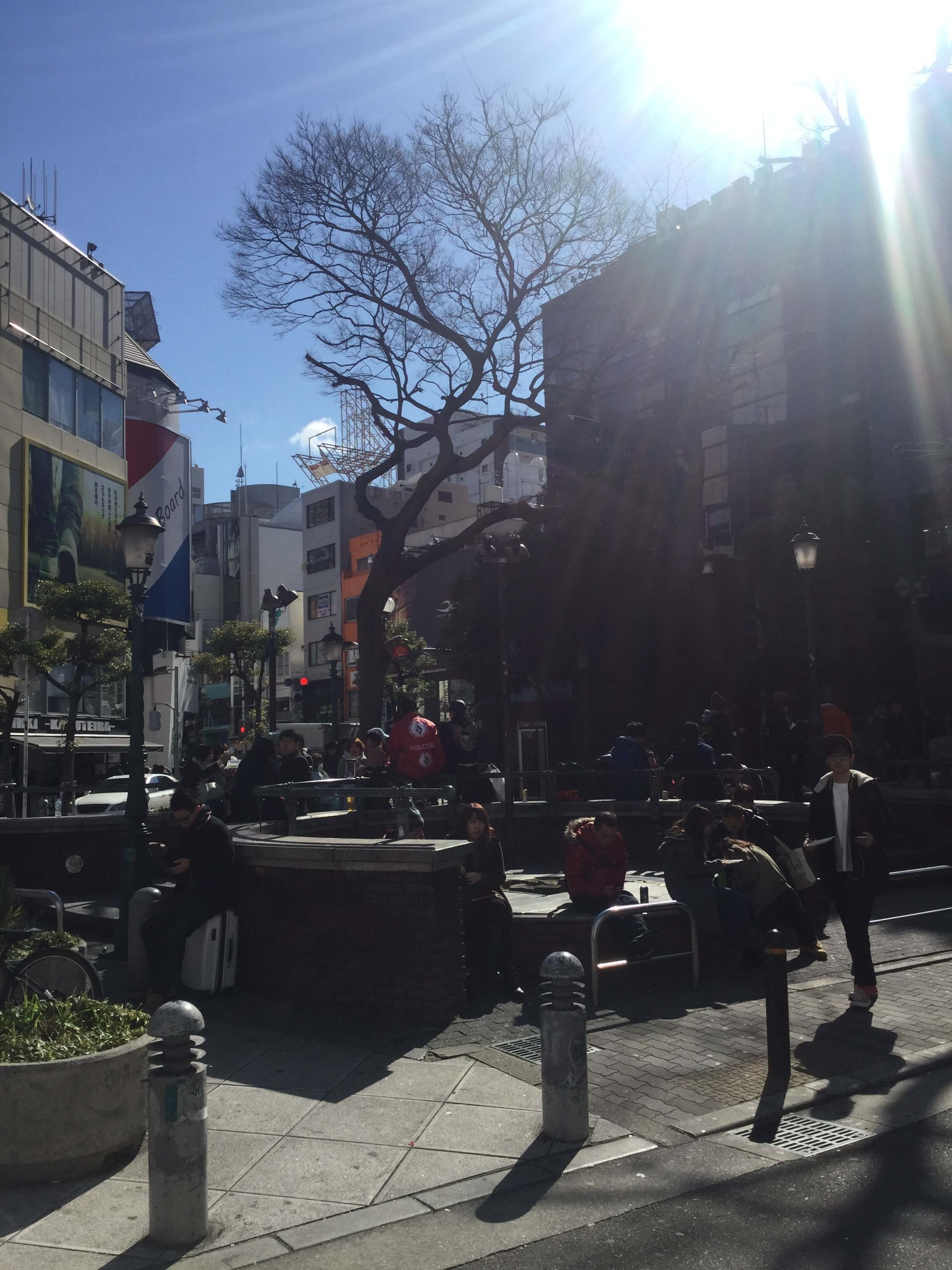 若者の街アメリカ村の三角公園前にあり、三角公園は甲賀流のたこ焼きを食べる人が常に座っています。逆光ですがこちらが三角公園です。