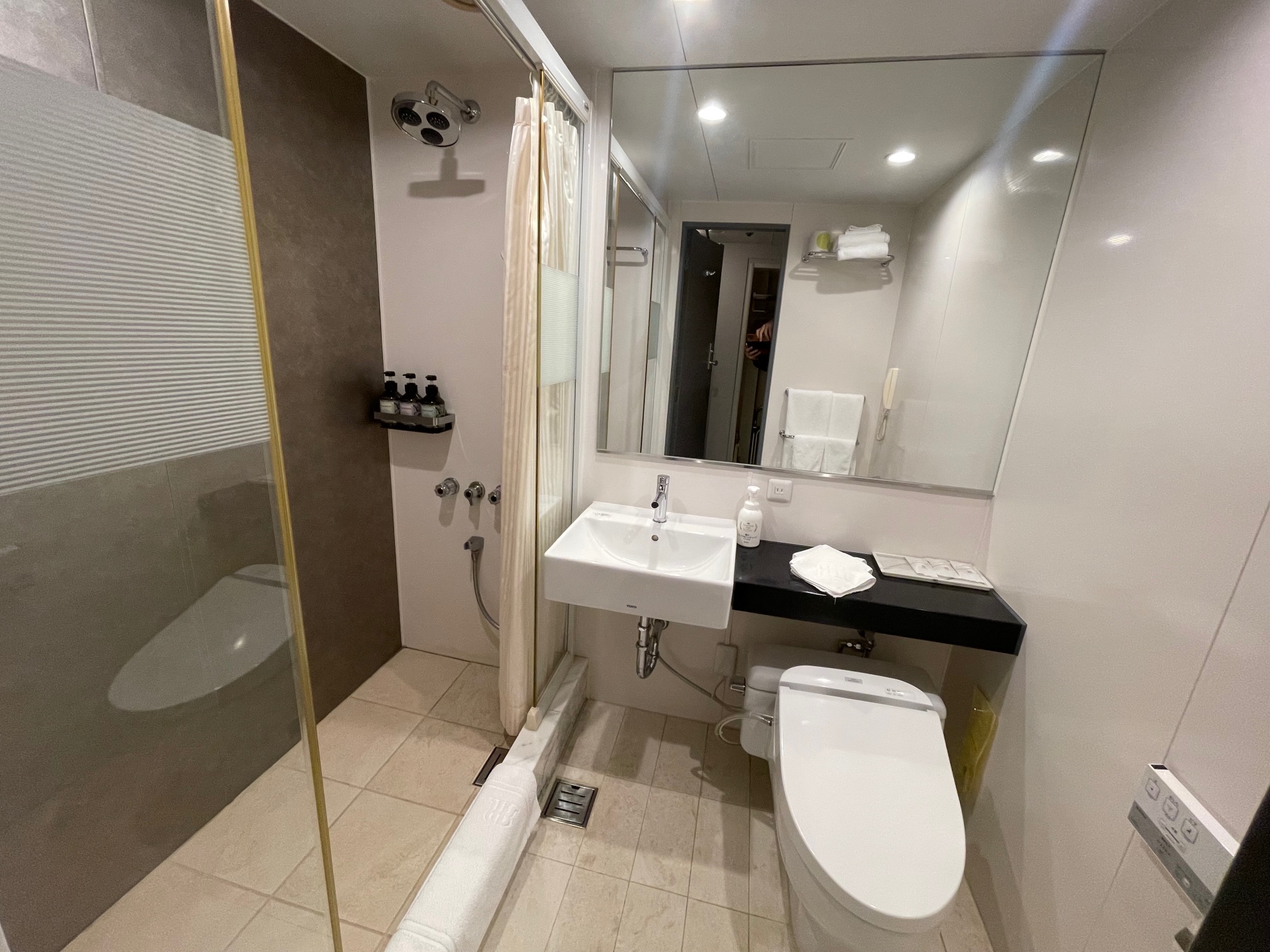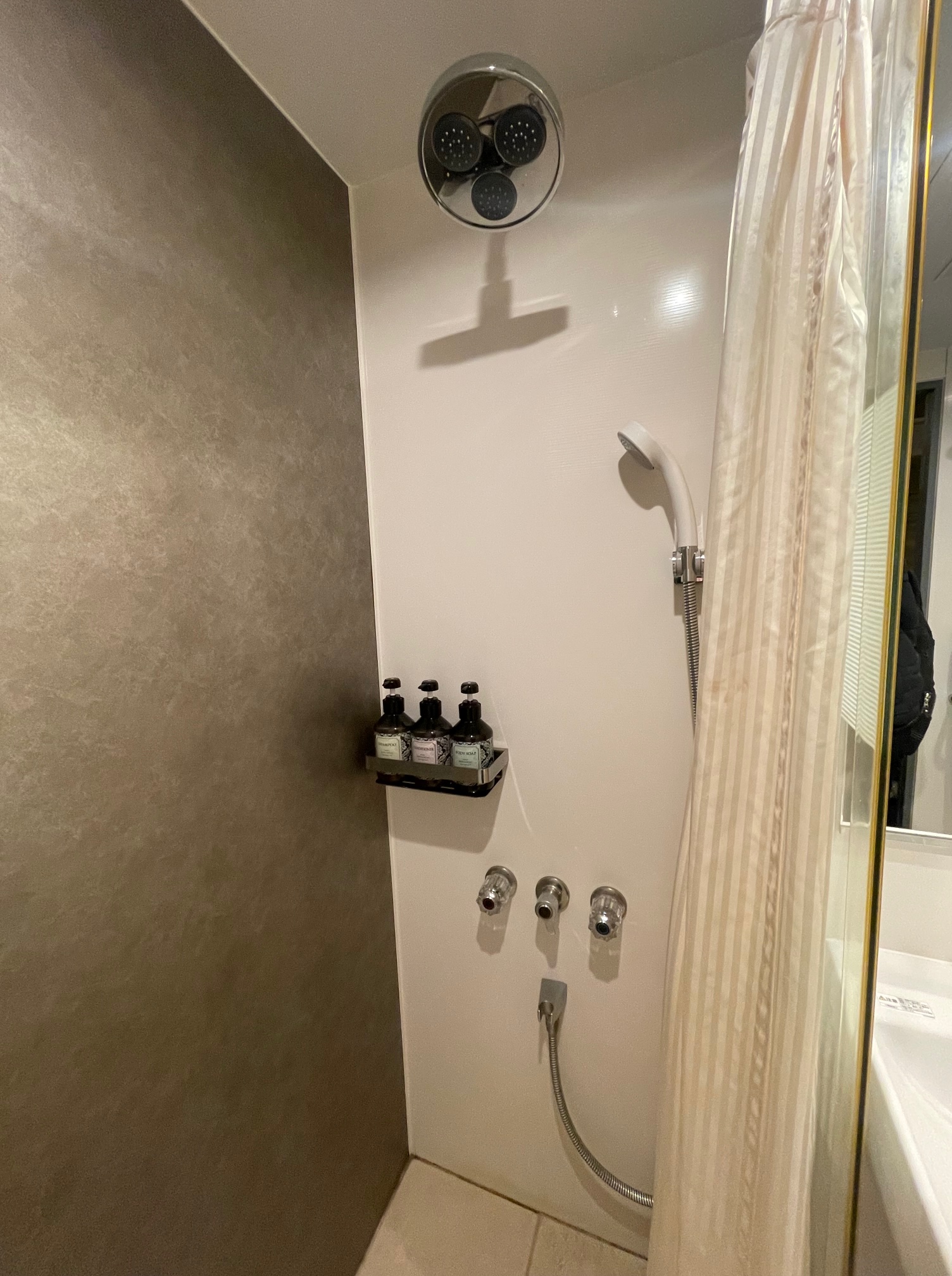 シャワーブースはカーテンでびっくりしました。一応レインシャワーもあります。