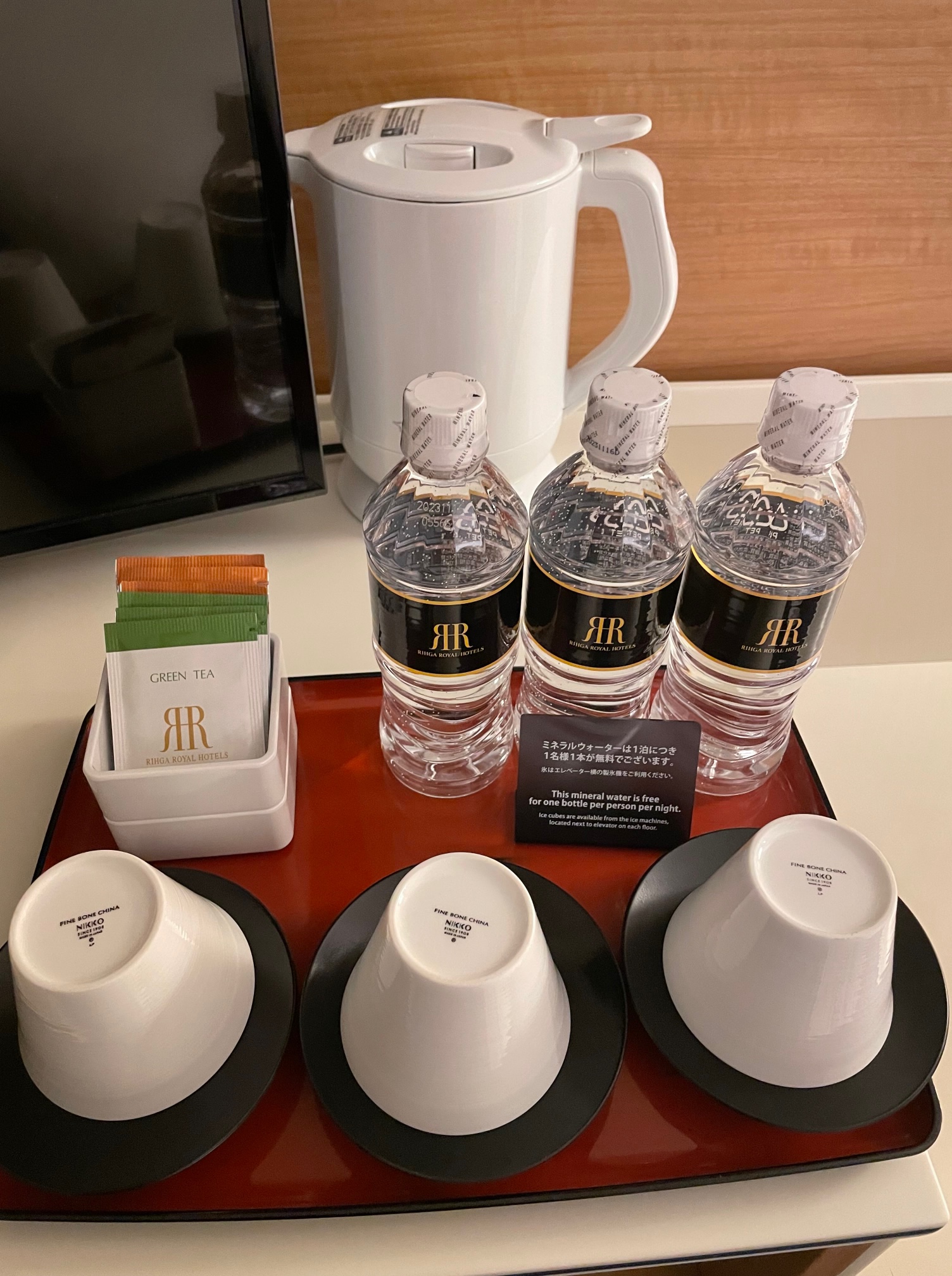 テレビ横には電気ケトルとサービスのミネラルウォーター、ティーバッグなど